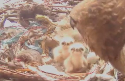 A pair of red-tailed hawks — the most common type in New York State — have taken up residence on a ledge outside the 12nd floor office of the president of NYU, of all places, overlooking Washington Square Arch. Two babies, called eyases, hatched this week, in a nest of sticks, plastic and pizza plates. White fuzzballs with jet black eyes and beaks. You can watch the development of the infants — obsessively, if you are like many New Yorkers — by checking in with the Hawk Cam set up by the New York Times. And it’s up close and personal, all the rat and pigeon tidbits the mother, Rosie, feeds the babies, usually dropped off at the nest by Bobbie, the father, and all the spewed baby hawk poop that often lands upon the lens of the camera.