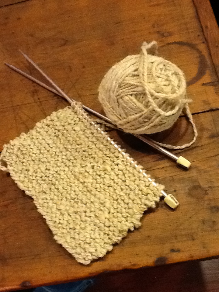 And I’m using the wool of the Jacob Sheep, an heirloom, small, piebald (white and black) sheep that boasts between four and six horns. (The biblical Jacob bred spotted and speckled sheep.) My un-died wool is handsome in a coarse way, spun the morning I bought it from her by the woman who raised the sheep. Plenty of slubs, and even some burrs.