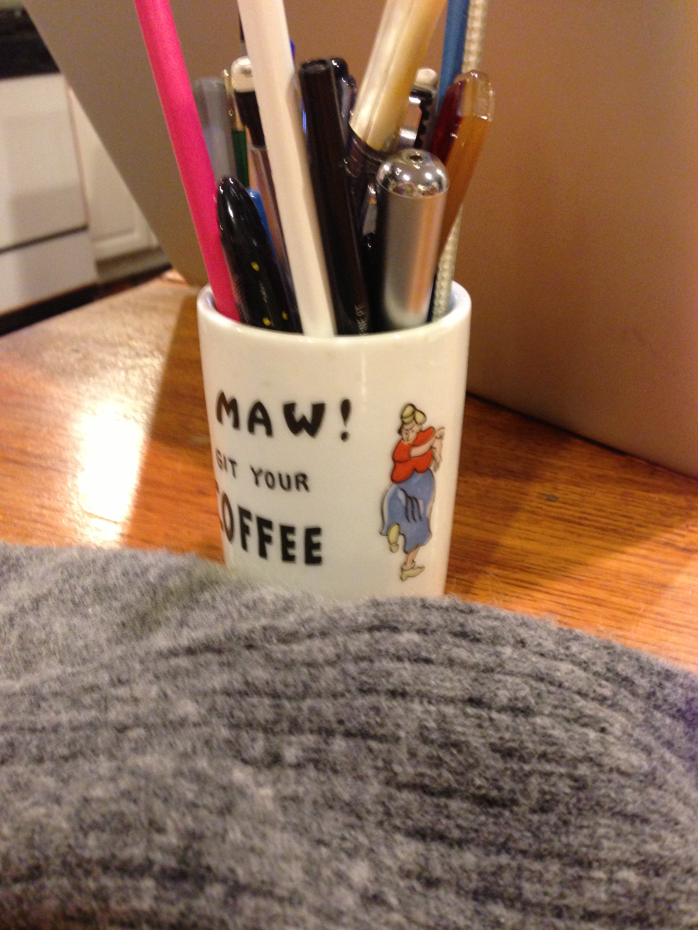 I started it today, and it is one of those tasks that is absolutely simple and terrifyingly complex at the same time. The cozy pumpkin color belies the difficulty – you have to juggle these four two-pointed toothpicks and tiny-gauge sock yarn and somehow get it to all hang together. First, the ribbed top, then the body, then the heel and the gusset and a toe. I’m not even sure yet what a gusset does.