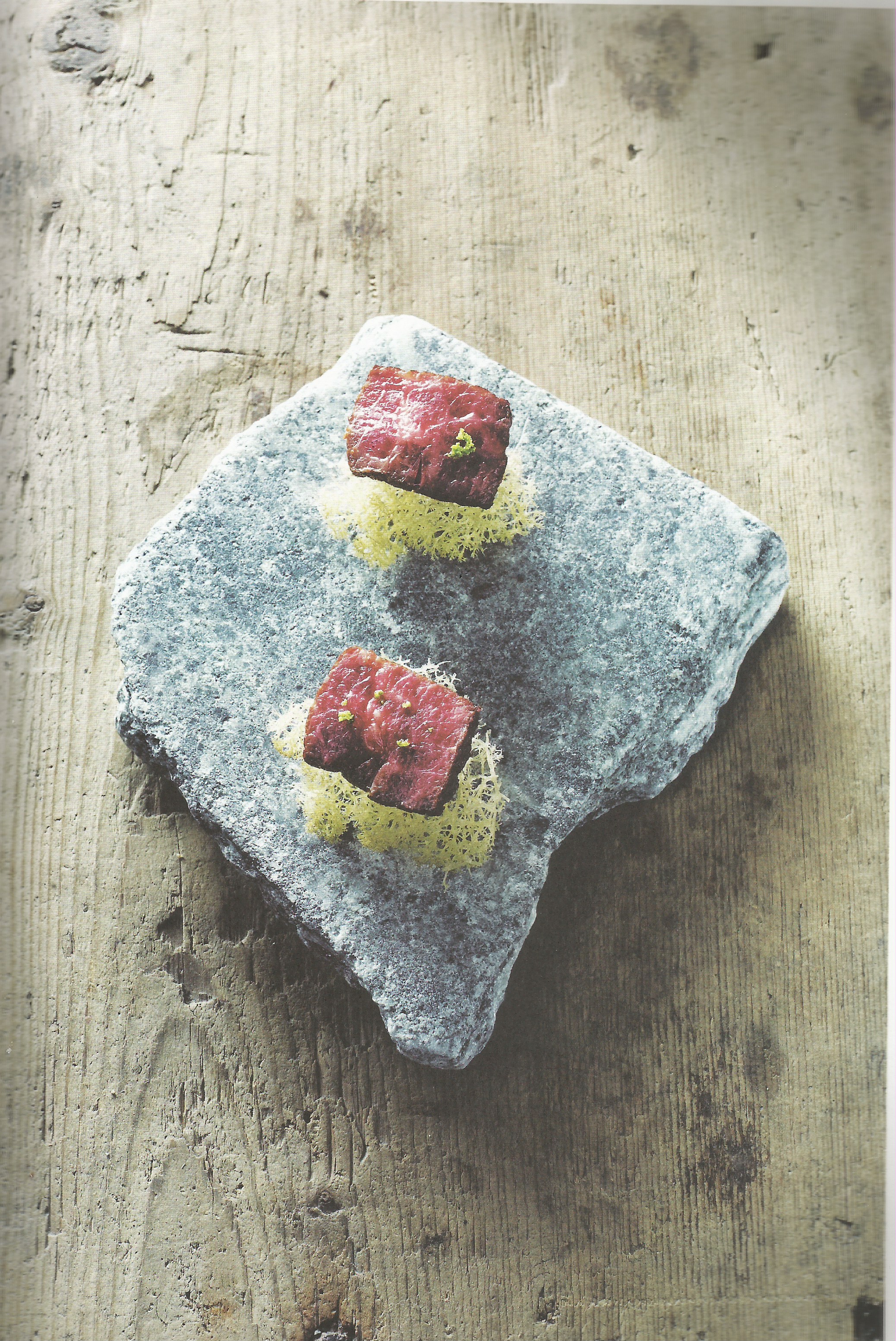 Magnus Nilsson loves lichen. He loves all the ingredients from Mud Pies, it would seem. A typical recipe: “Pine mushroom, lamb’s kidney, pickled marigold.” Wild plants distinguish his cooking. “Vegetables cooked with autumn leaves.” And perhaps the most spectacular yet absolutely simple preparation: “Vinegar matured in the burnt-out trunk of a spruce tree.”