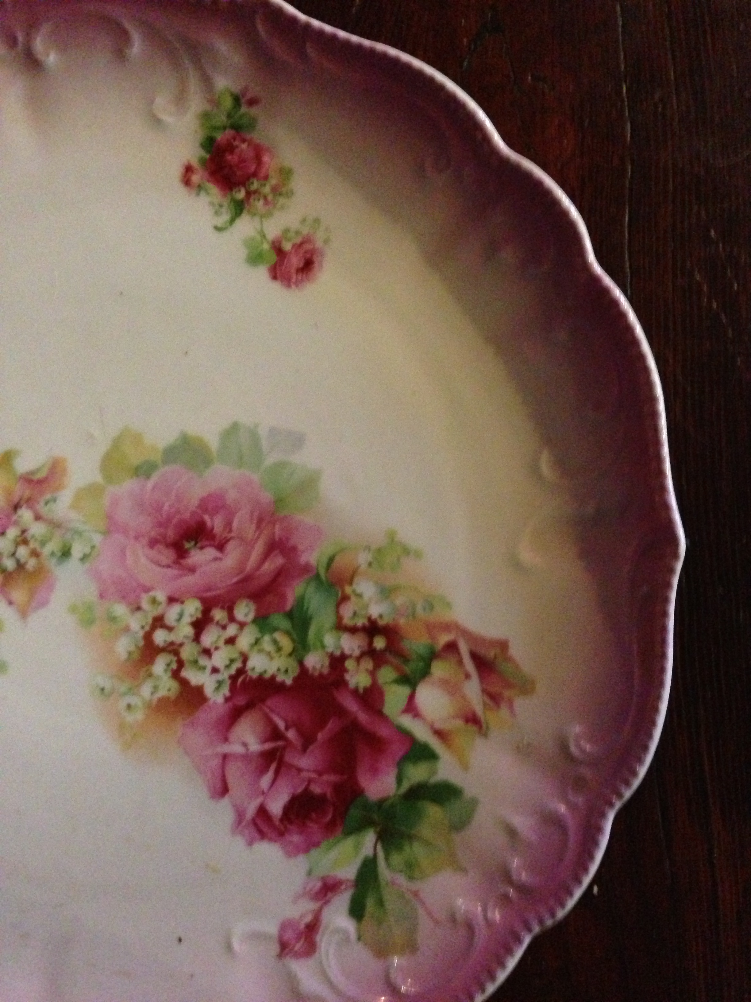A cake plate. A nice size, a full foot across, embellished by deep pink roses and lilies of the valley.