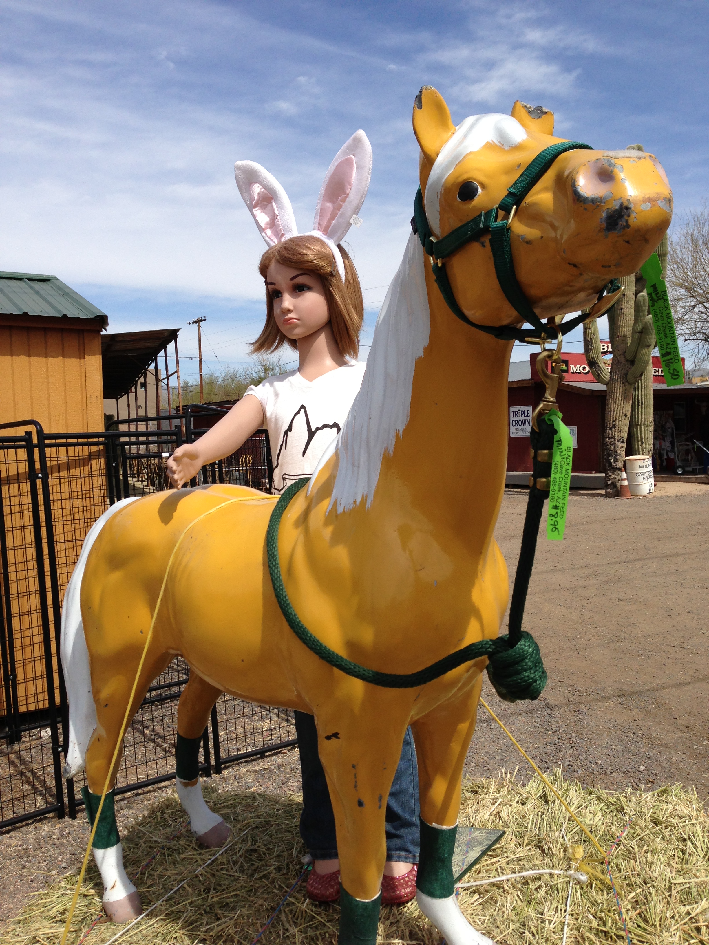 The life-size mannequin stands outside a feed store in Cave Creek, sporting her Easter finery, advising motorists that they better come in and make hay while the sun shines.