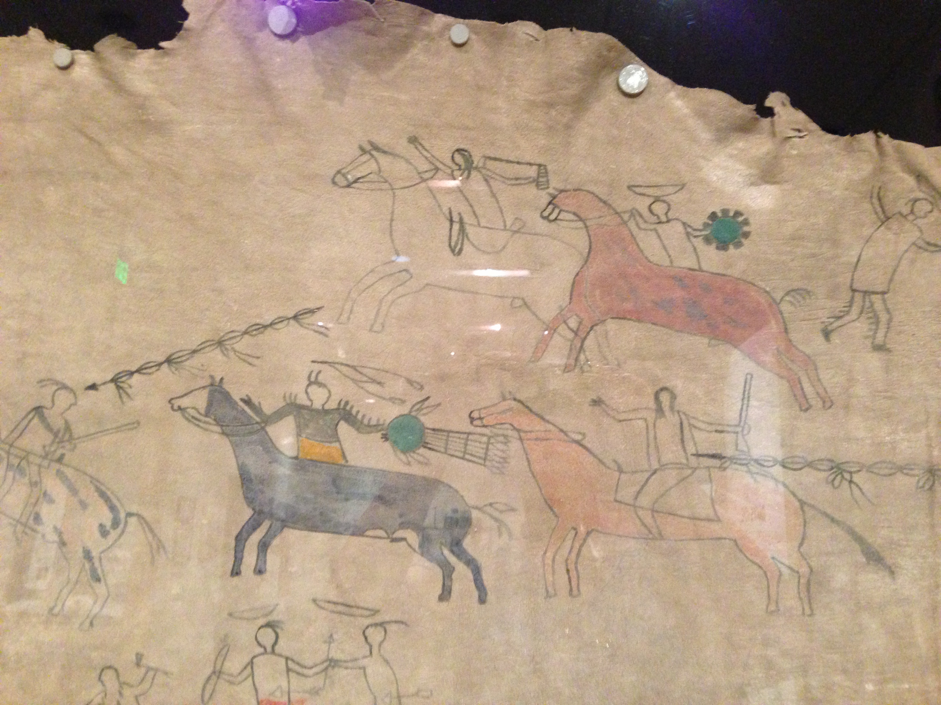 Different, of course, yet similar to Becker’s faded attempts, the ledger art of the Plains Indians, a phenomenon through which artists got their story out between about 1865 and 1935. Originally, the tanned skins of bison were used for painting individual scenes or narratives, using natural pigments. This one dates from 1880, and shows a battle between the Cheyenne and the Pawnee.