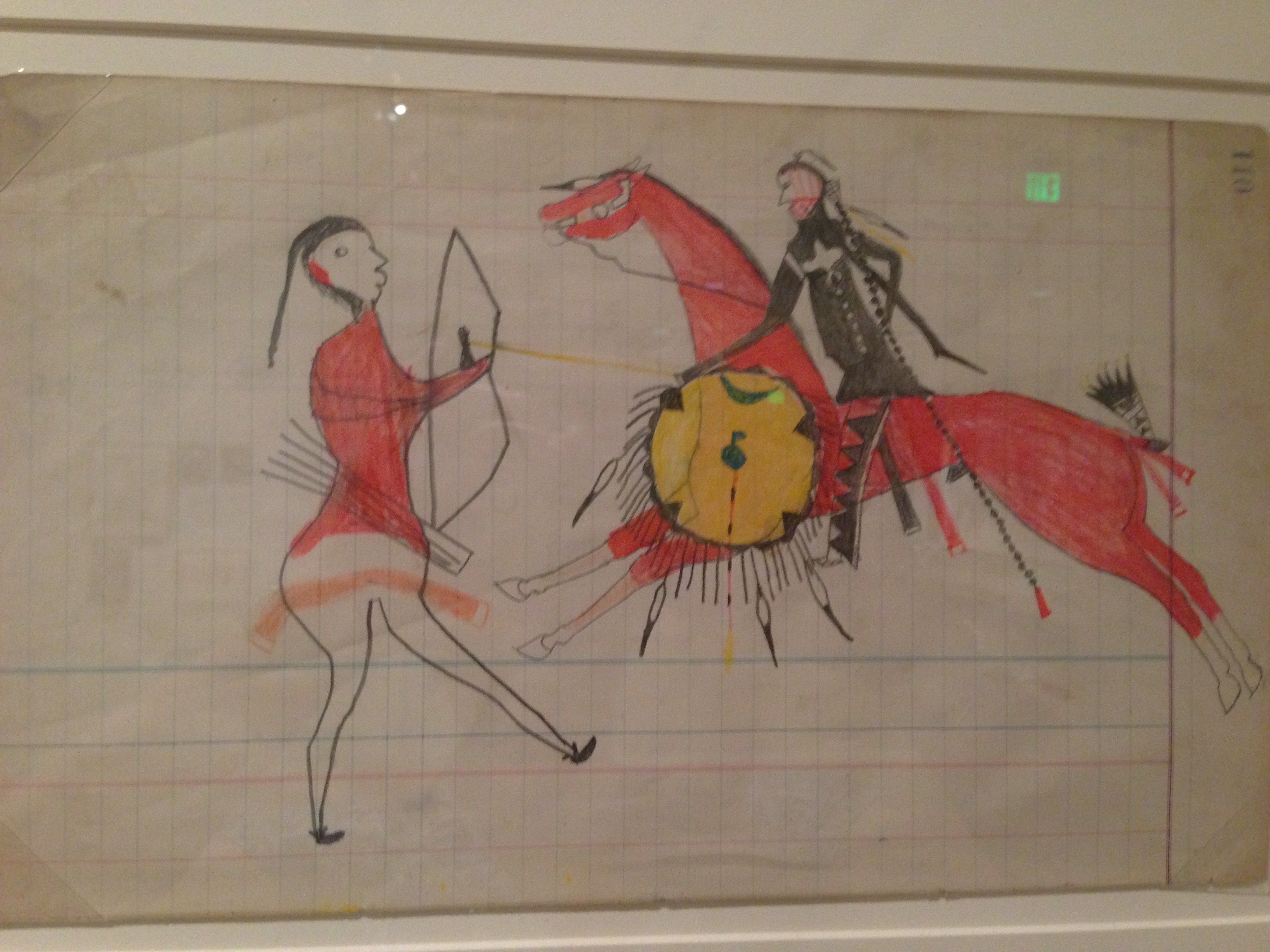 The U.S. government initiated a mass slaughter of the bison in order to reduce the central food source of the Plains people. So no more natural canvas. Artists transferred their pictogram paintings to either muslin, woven canvas or, most interestingly, paper ledger books, the ordinary kind businesses used to keep their accounts.