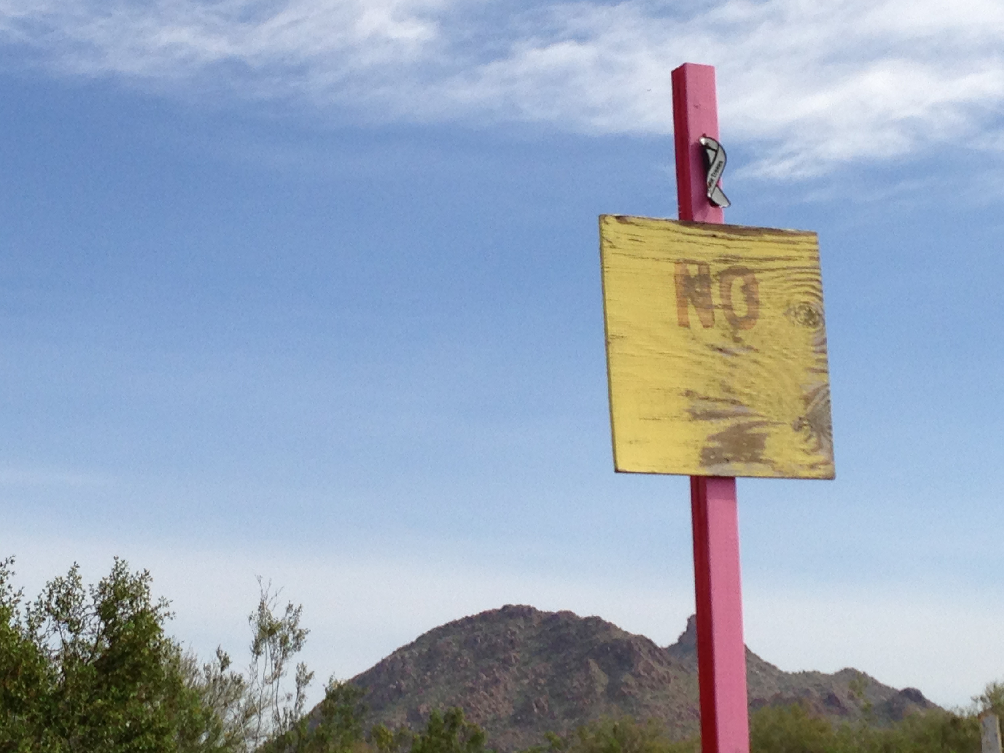 No what? you may ask. The message has been lost to time, and now suggests, at least to me, a kind of quintessentially Arizonan plywood sentiment … no to gun control, no to “illegals,” no to same-sex marriage, etc. etc. But I like the mysterious No on its own. The signs rim the lot and insist upon their own importance.