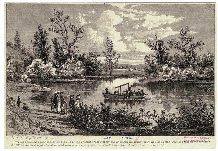 Close examination reveals “resorts” where genteel residents could take the air – a famous pleasure garden named “Vauxhall,” for example, on Greenwich Street between Warren and Chambers, the future site of Soho – a good place to dine and dance and stroll through sylvan landscapes. There was a similar hot spot called “Spring Garden,” and one she labelled simply “the winyerd.” She rendered the pools where romantic idylls might take place, Buttermilk Pond and Sweetmilk Pond, as well as the major source of clean drinking water, the Collect, later submerged under Canal Street.
