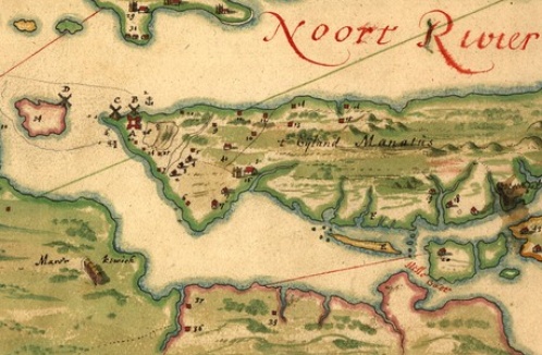 More intimate, and more resonant for me, with a sweet hand-drawn feel, is the 1639 creation known as the Manatus Map, inked in Holland, which highlights the red-roofed farmhouses of the island and flags the names of their owners, along with delineating windmills and hayricks. The background forms a green field against a coastline of soft blue, the whole comprising a somehow idyllic picture of Manhattan at its first settlement by Europeans. It looks, appropriately, like there were only about 25 people living there.
