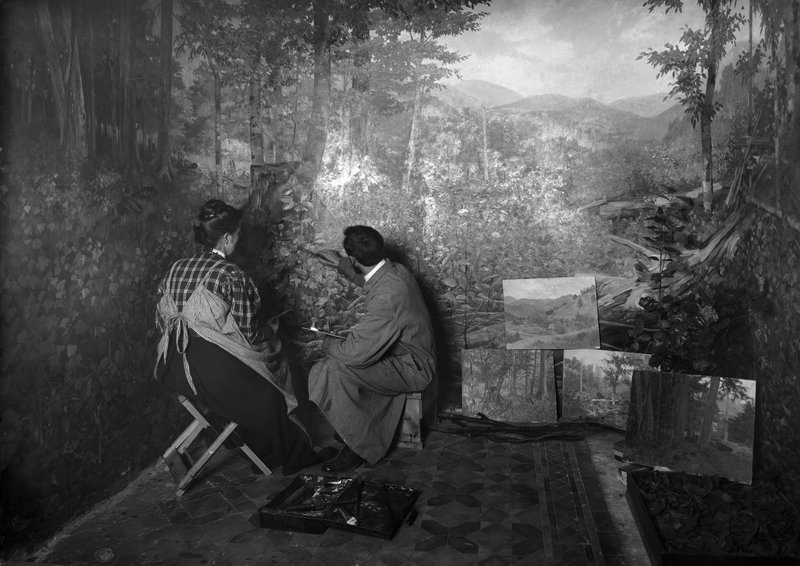 It must have been magical to be in it, in the diorama, from the beginning, if you could. To actually make one. Here are Mr. and Mrs. Bruce Horsefall in 1907, at work painting the background of the Wild Turkey Habitat Group in the North American Bird Hall.