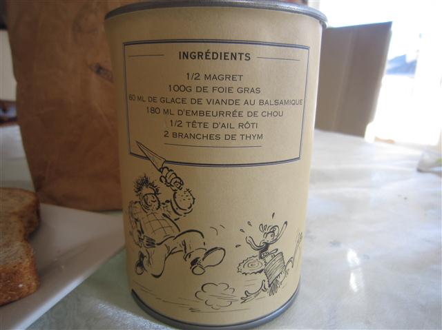 Gil and I ventured to Au Pied de Cochon in Montreal. For a while afterward we didn’t get our cholesterol levels checked. The menu includes such delicacies as Tarragon Bison Tongue and Foie Gras Poutine (foie gras is their speciality, along with everything pig-related), all of it drenched in butter. It was here that I had the famous “duck in a can,” consisting of a duck breast, a lobe of foie gras, half a head of garlic and some kind of spectacular gravy packed into a metal can, like a soup can, and boiled.