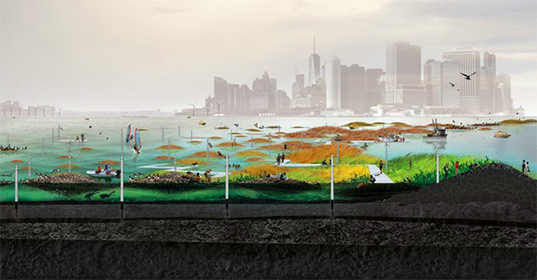 She decided to use a cheap marine mainstay she refers to as “fuzzy rope” and build nets for the shellfish to cling to. (They brought knitters in to weave prototypes in the studio rather than drawing them.) Ultimately the reefs will serve as storm surge protectors and habitat for sea birds.