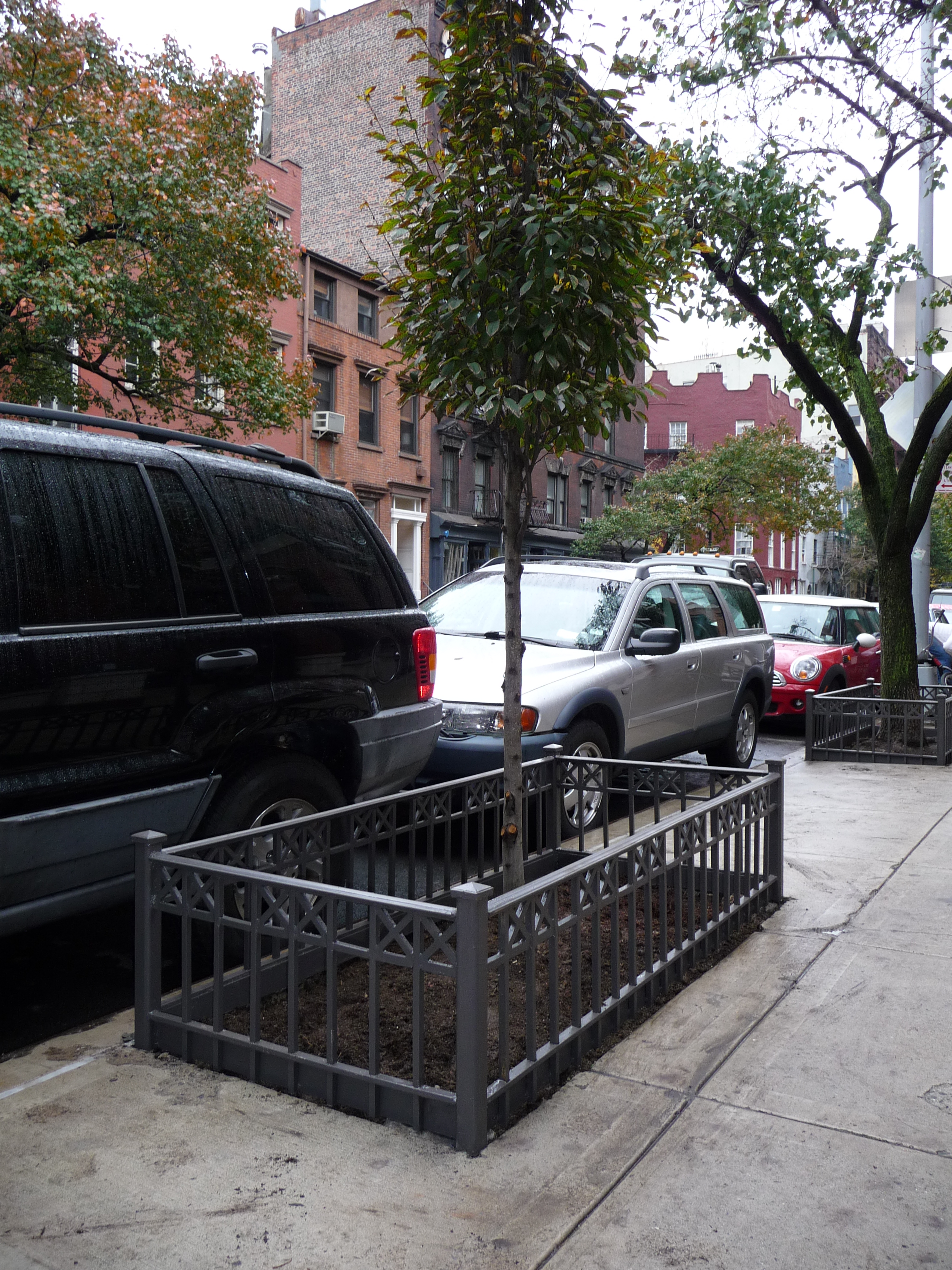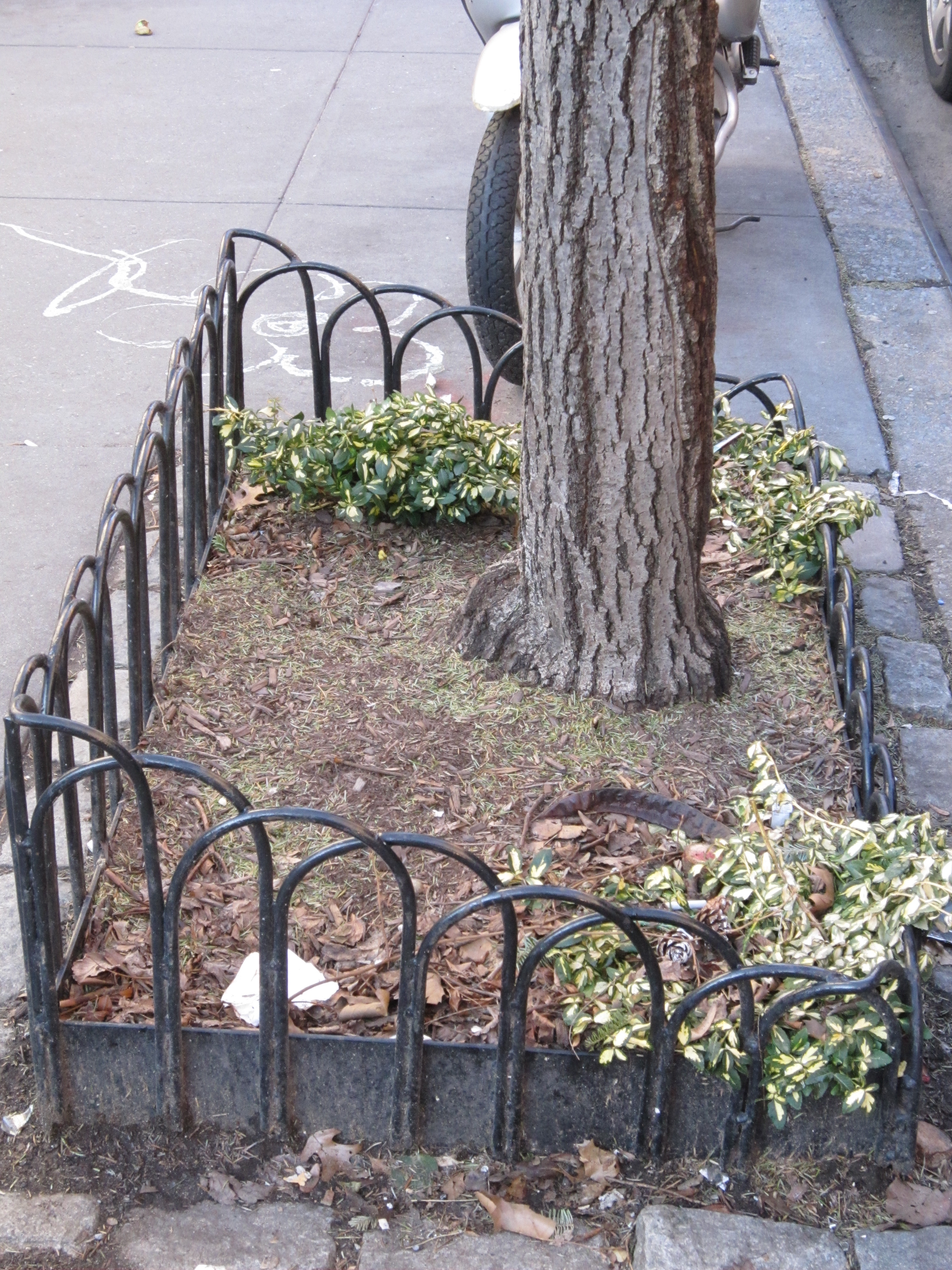 Yes, tree guards do matter. Here is one you probably have overlooked every time you ambled down a New York City sidewalk. Eighteen-inch iron hoops all around. Shielding a little root-friendly plot that is blessedly feces-free.