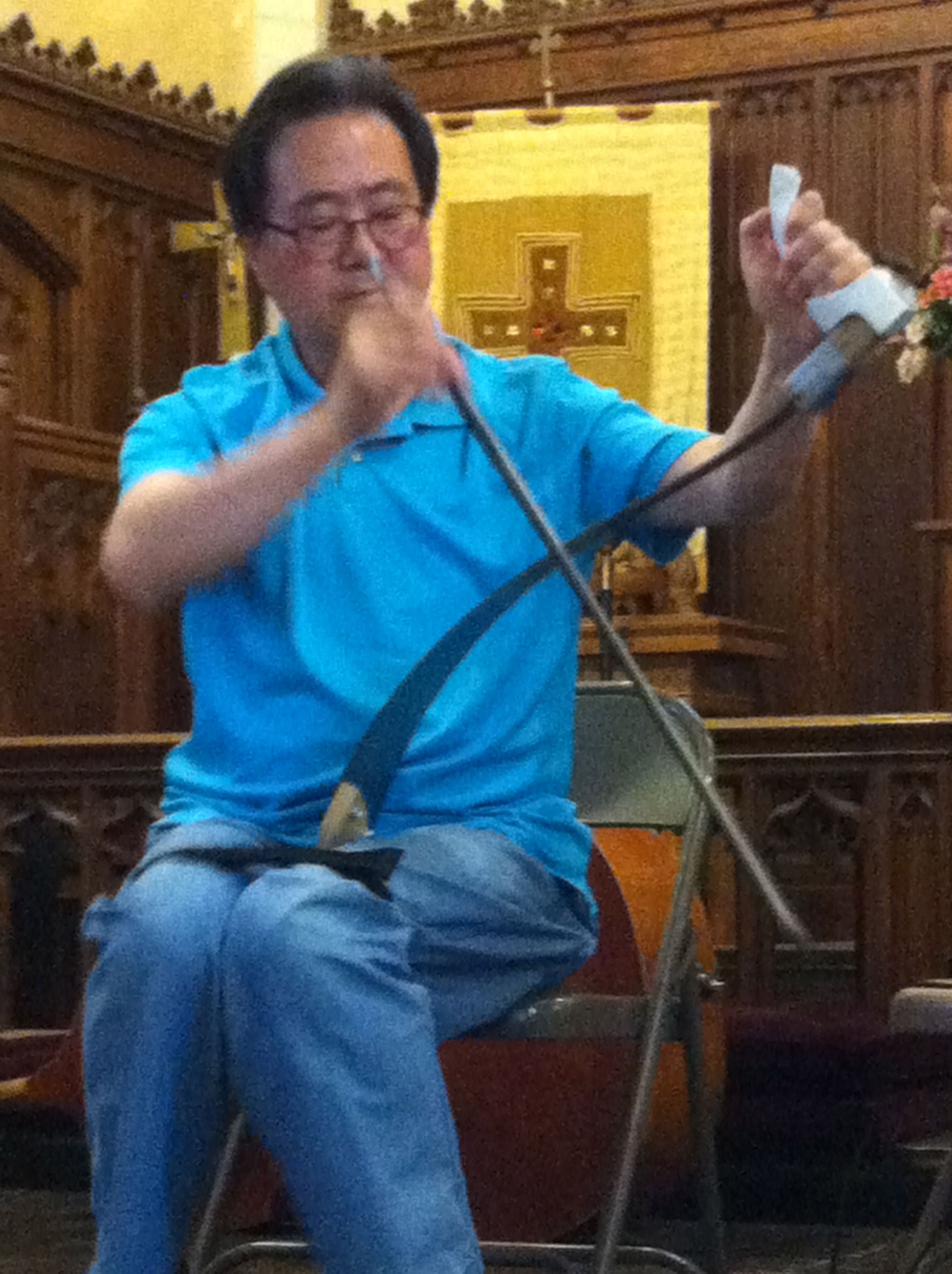 Arriving during an intermission, I wandered around the pews and found people in an almost giddy state of shared purpose. There was a musical saw art exhibit, musical saw poetry, the premier of musical saw score for the movies, and solos by dozens of sawists from around the world. Workshops were scheduled for novices and experts alike. There would even be a “chorus of saws” in which all the musicians present would work out as a group, accompanied only by a piano.