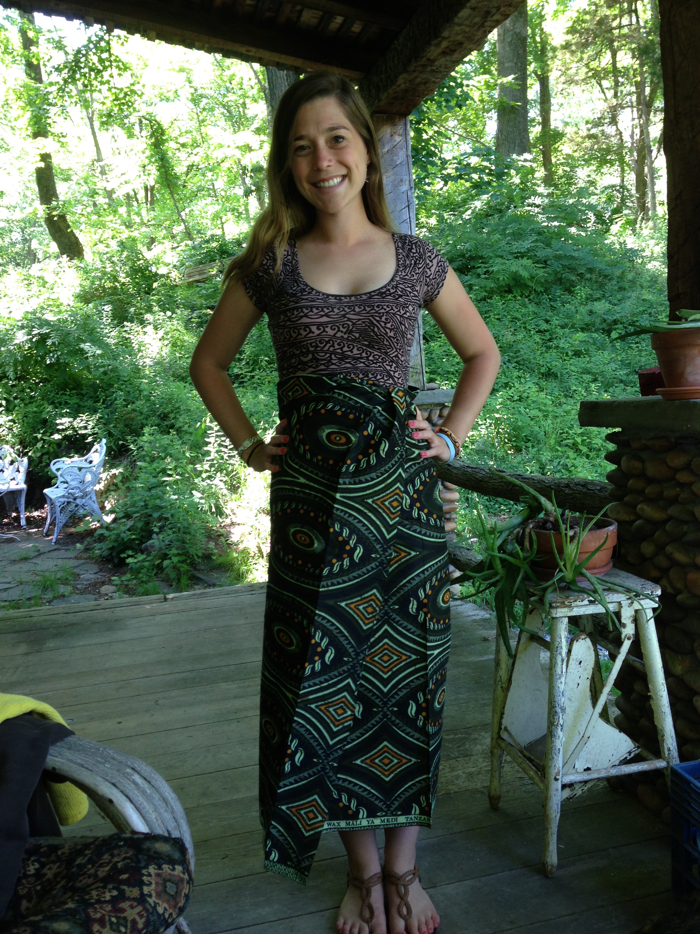 Wearing a chichinge, a wrap skirt of block-printed African cloth. Her resilient muscles are only a little sore, and she seems impervious to jet lag after 20 hours in the air.
