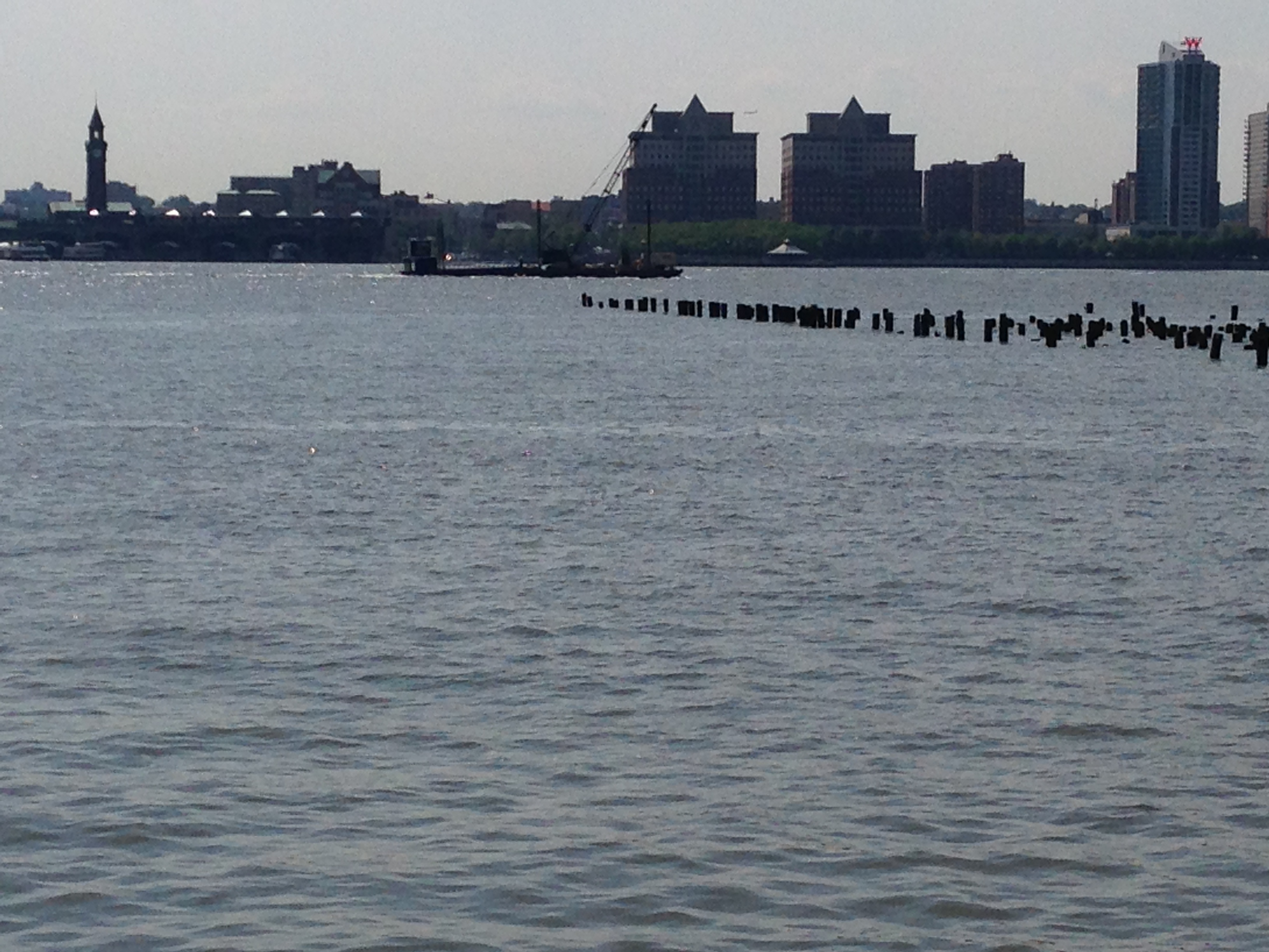 Here at the pier, extensively remodeled and cleaned up by the city in recent years, we listen to the waves of the Hudson lightly slap the pilings. Directly south of us the Freedom Tower, still a work in progress, balances at least one crane on top.