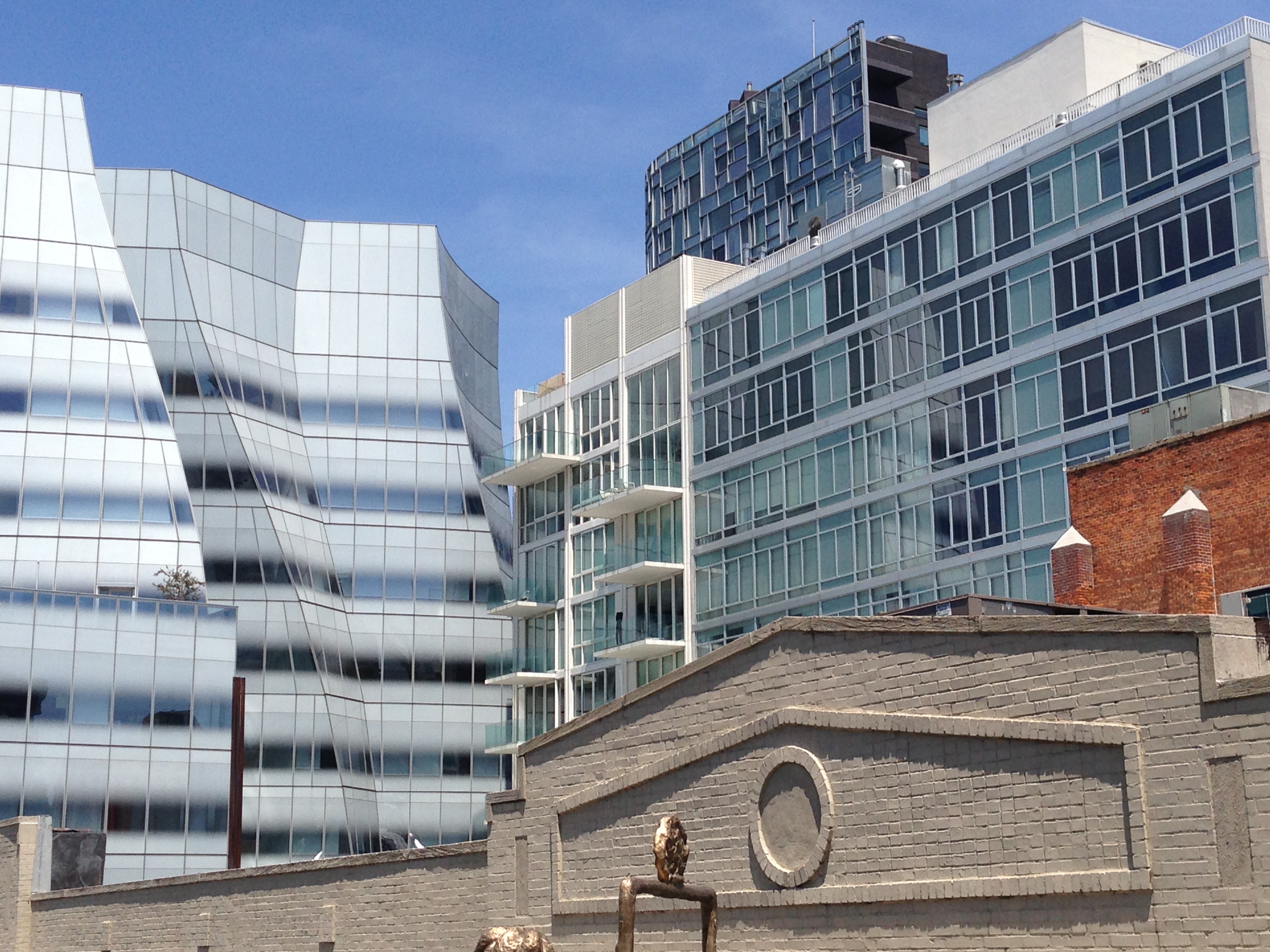 The Gehry-designed IAC Building, at 555 West 18th Street, with its milky, origami exterior, has been open since 2007. Vanity Fair called it the world’s most attractive office building. It’s especially great to see it in tandem with structures of other vintages, including the old-fashioned piedmont of a lower one whose top is flush with the park.