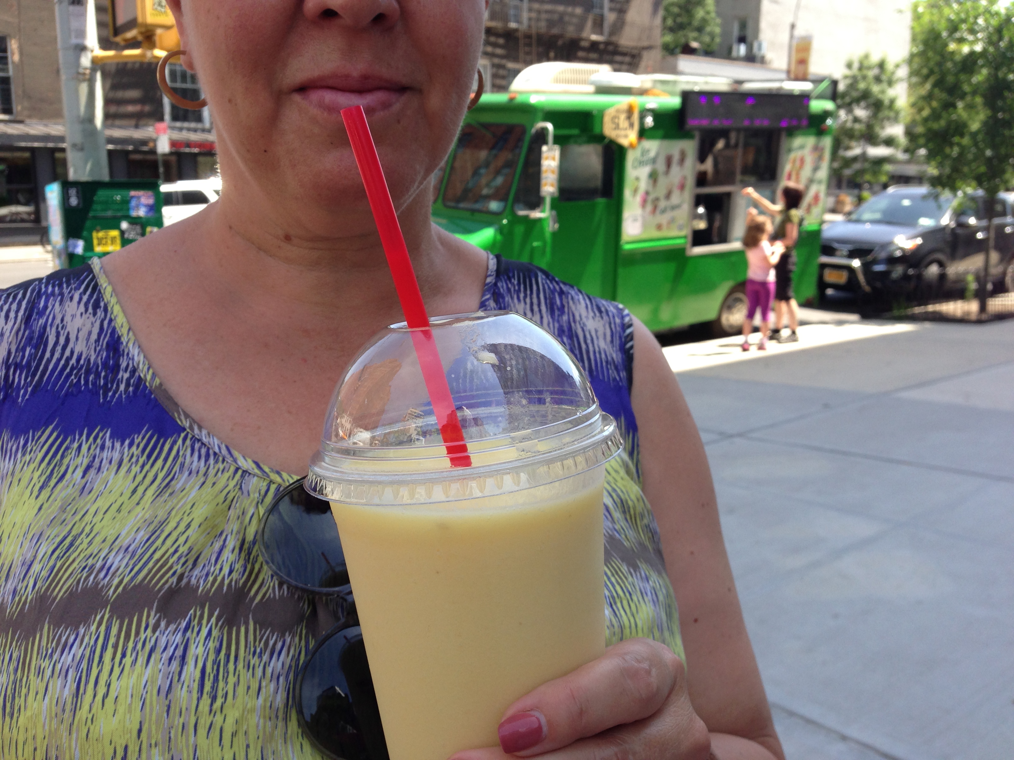 The chef strews the shoestrings here with shreds of rosemary. Everything tastes better after the High Line. An ordinary pinapple smoothie from a new perspective.