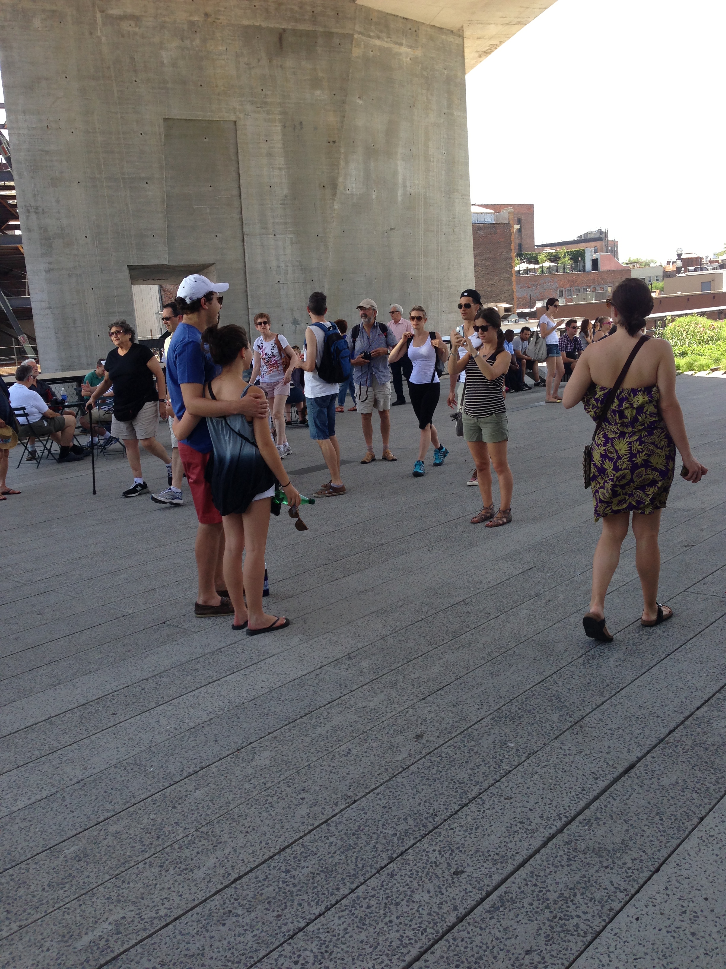 And human sculpture, as people freeze for pictures. What the High Line should have next to the fresh fruit ice pops stand is a camera kiosk. Someone would get rich. Tourists throng — you can walk a long way down the path and not hear a word of English.