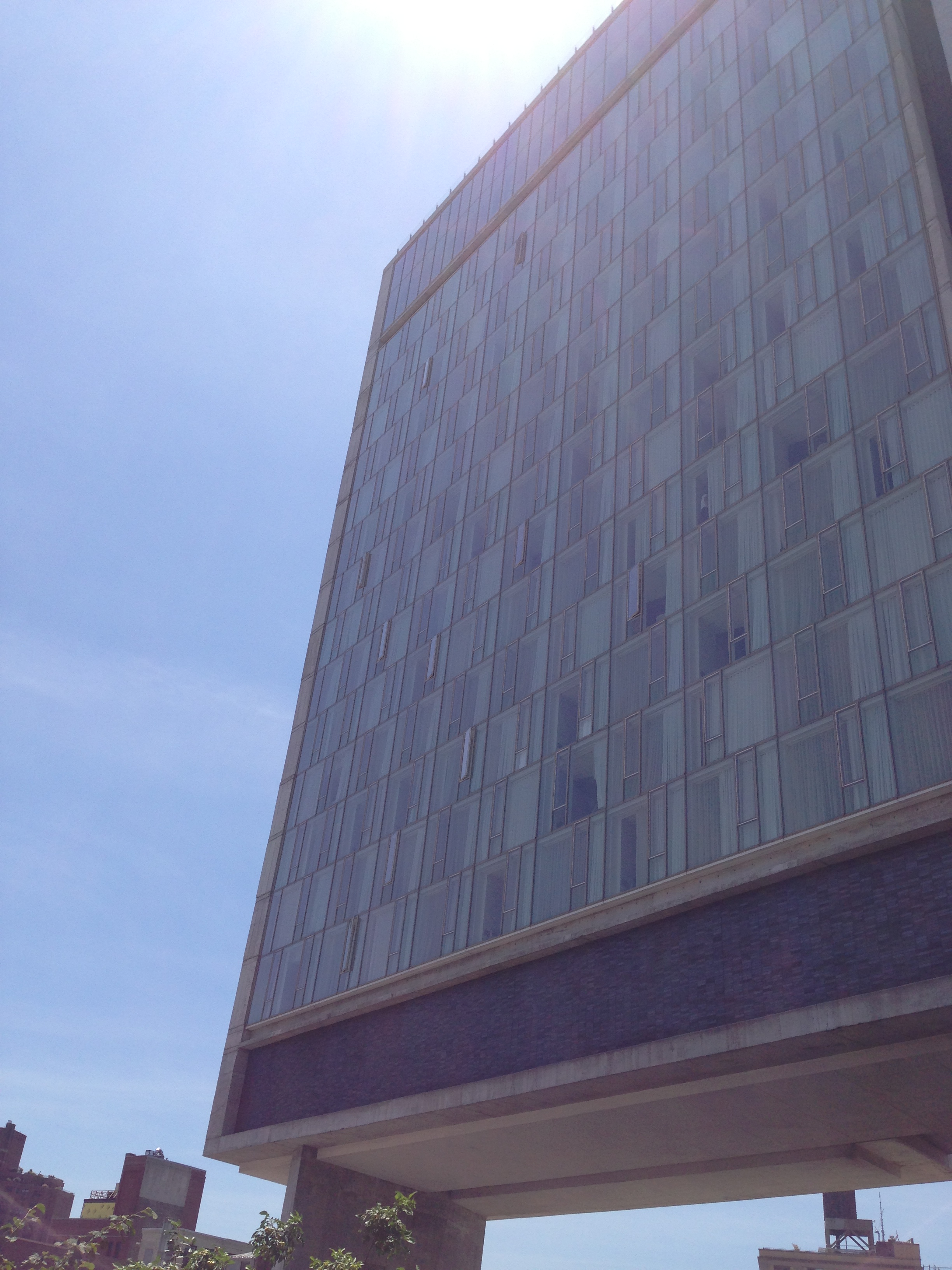 The Standard Hotel soars above. It gained some notoriety when High Line strollers realized they could look up and see happy exhibitionists making whoopee in the floor-to-ceiling windows.