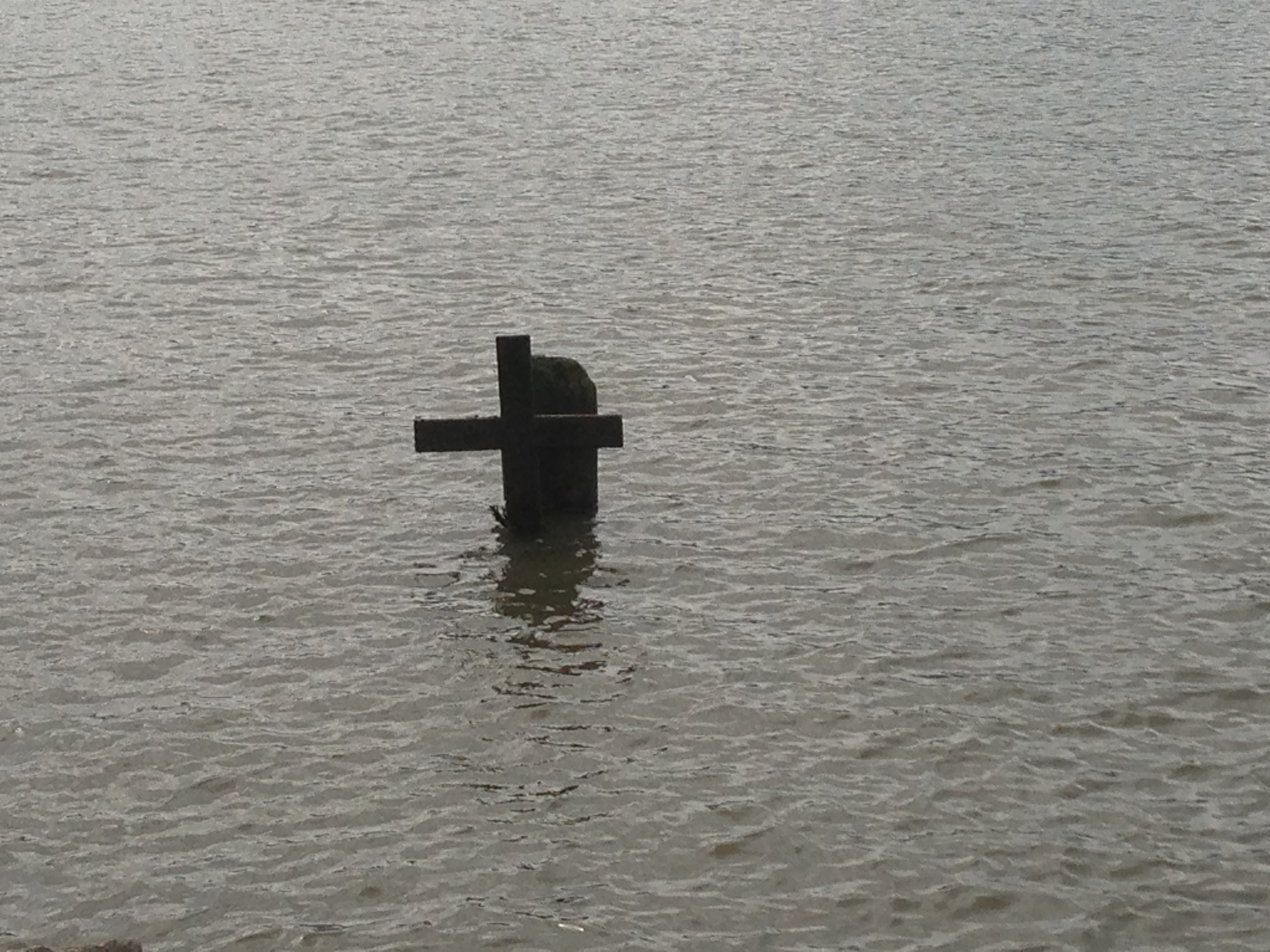 A large wooden cross, fastened to a piling, the tide lapping up against its neck.