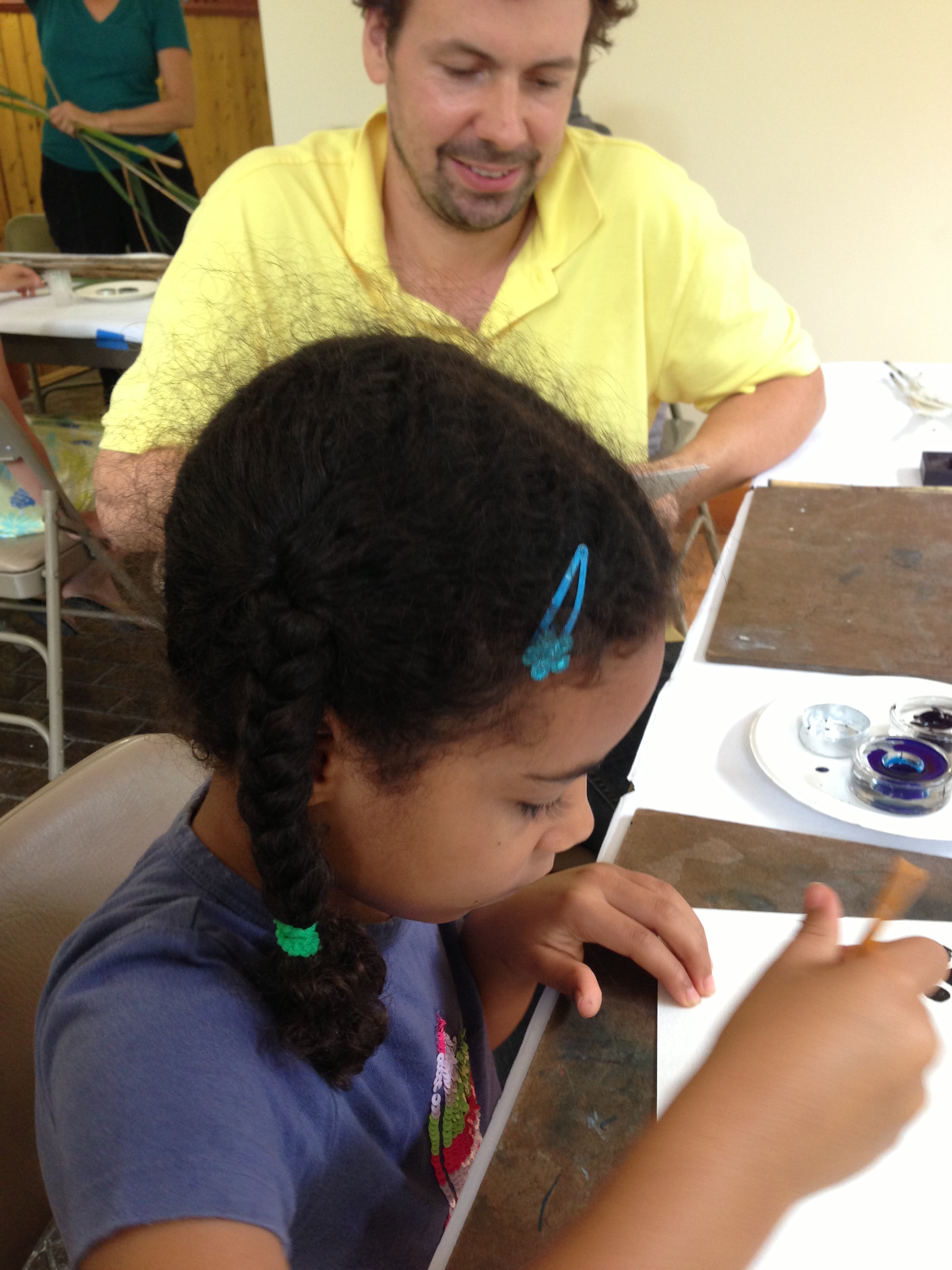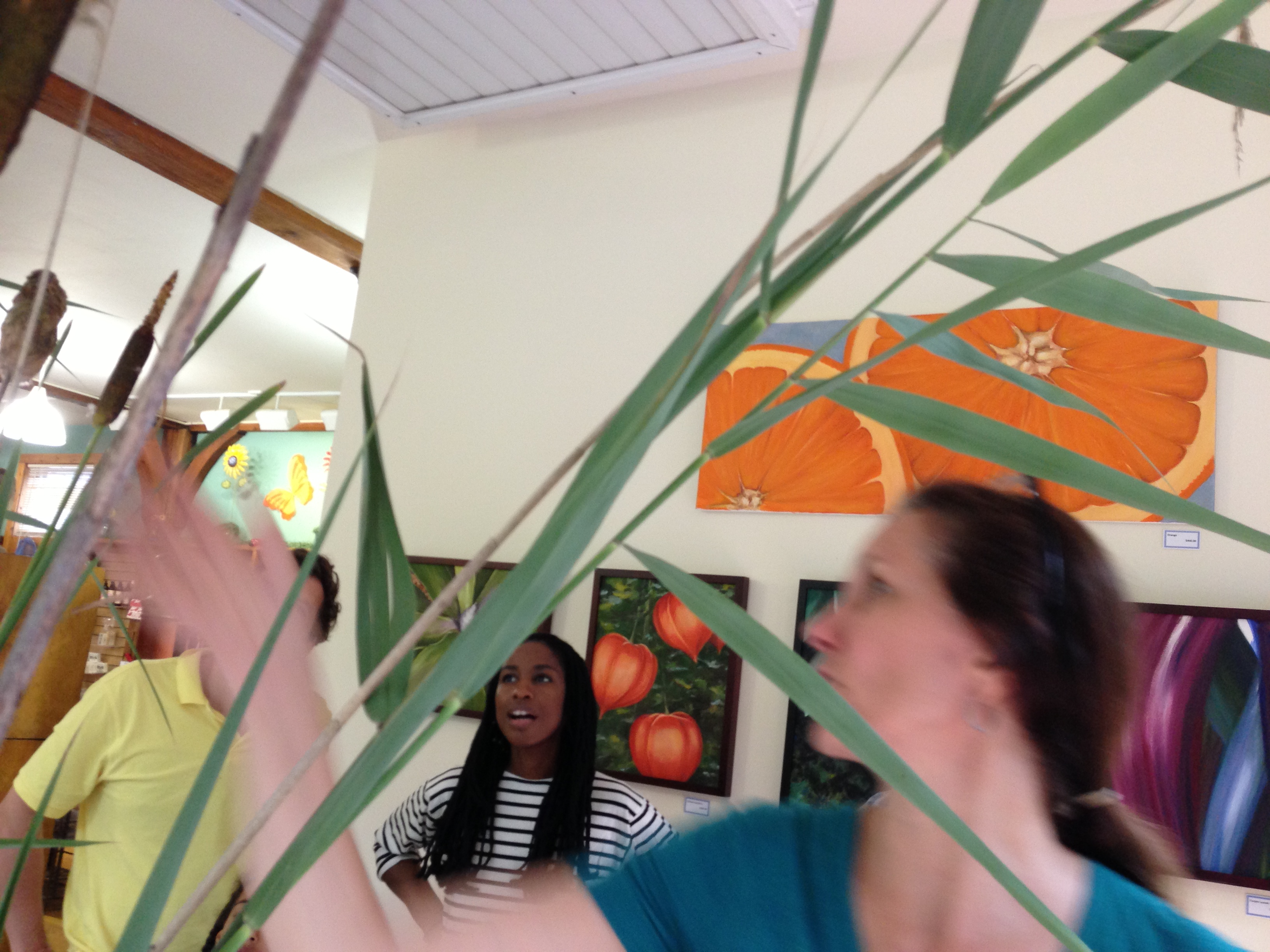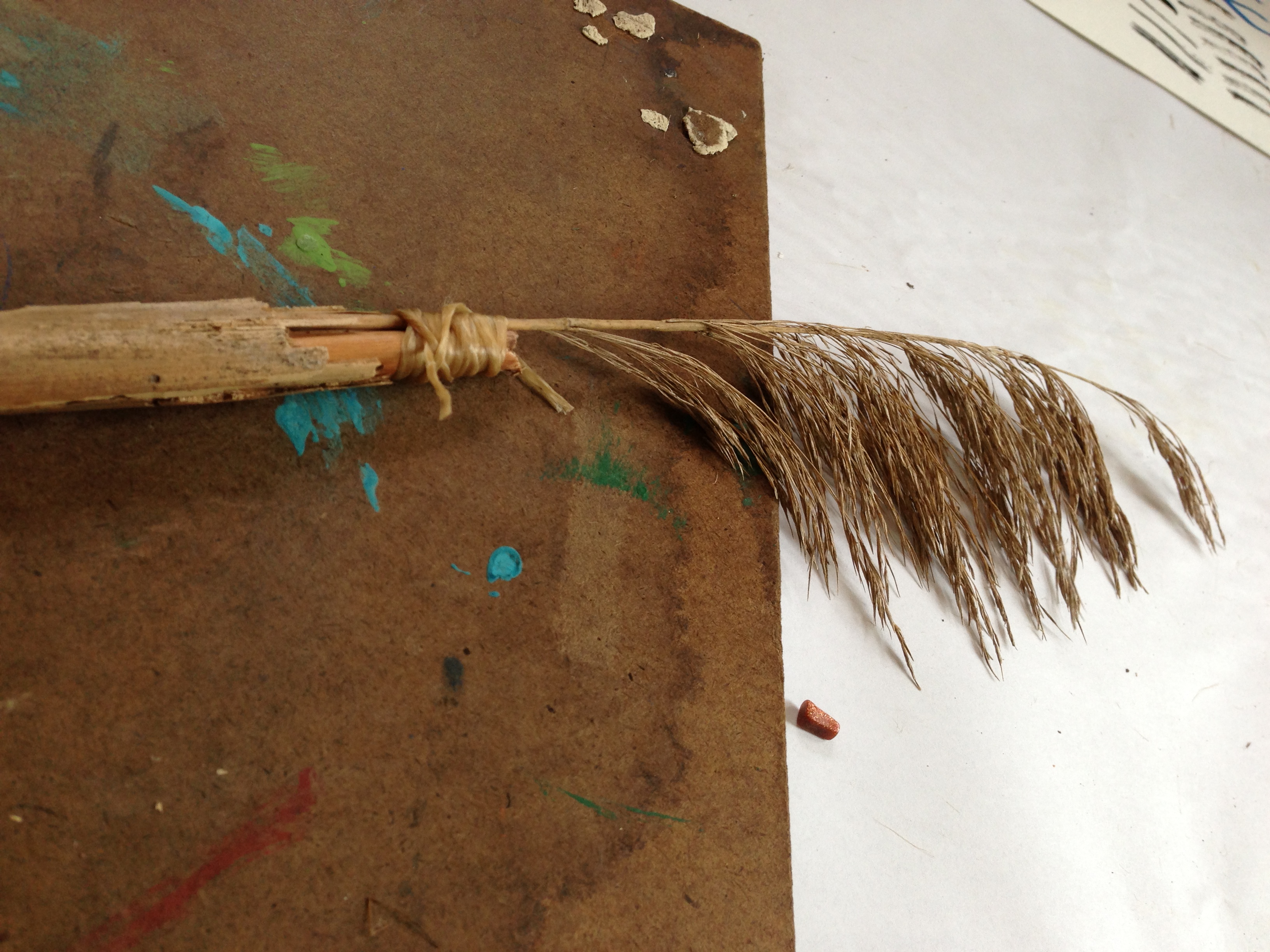 The artist-teachers discovered that for their purposes, the phragmites has a hollow stem like a traditional quill pen whereas the cattail has a spongy interior “much like a magic marker,” as Laurie said. Both work for painting.
