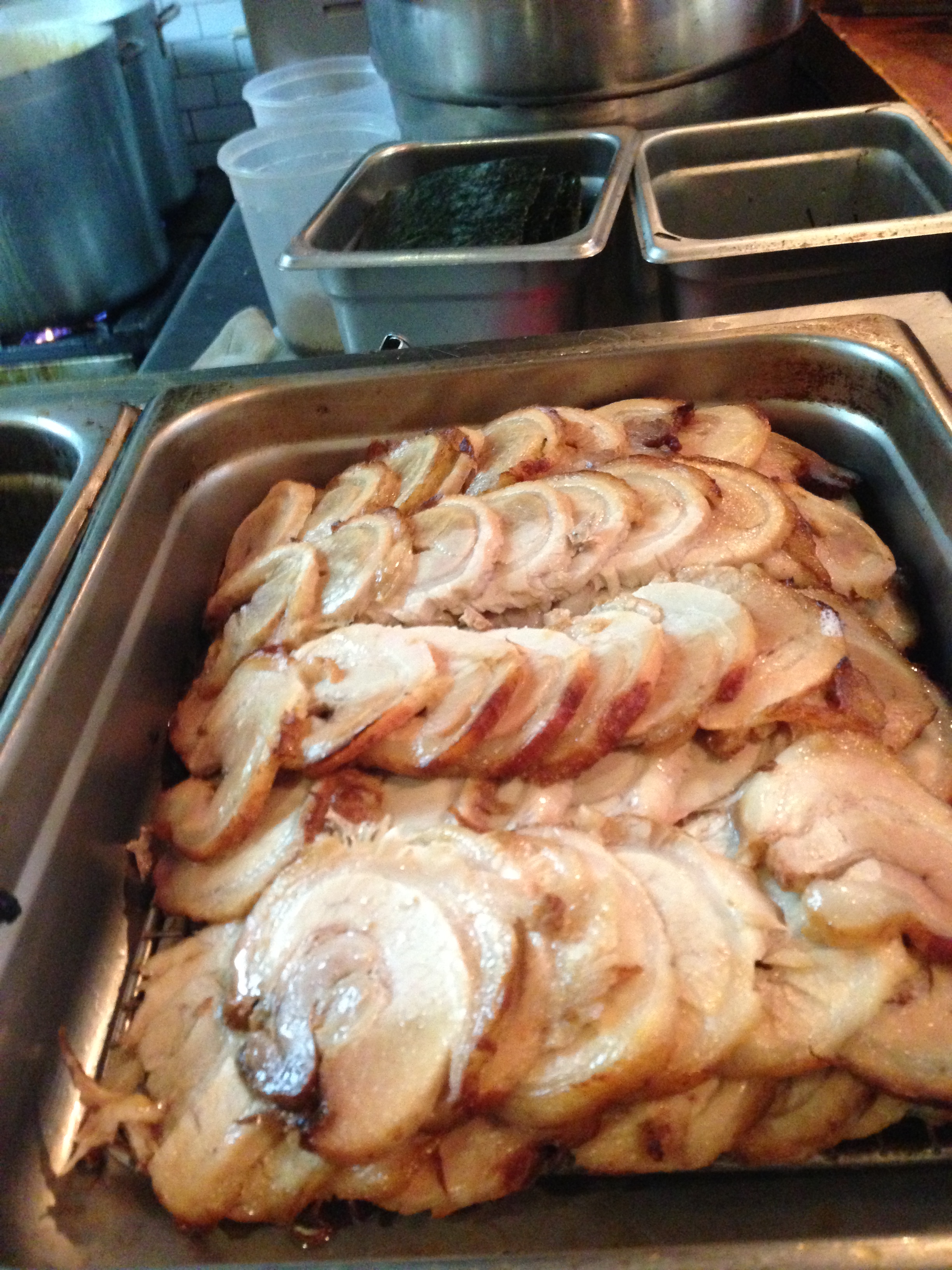 The chef. His name is Joseph. The broth pot, the size of a small boulder. At Jin, they cook the broth to make tonkotsu ramen for hours, pork bones at a high boil, resulting in a creamy texture that’s sort of like a savory gravy. They spoon it into each bowl with a giant’s ladle, then Joseph applies the fixings. The sliced pork belly.