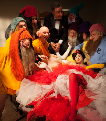 I read a review that said the show “put the grim back into the classic Brothers Grimm fairytale.” I saw it as a series of extravagant what-ifs. What if Snow White had a split (or triple) personality? What if there was a handsome prince who didn’t rescue her but treated her more like a centerfold than a princess? What if Walt actually appeared in his own movies alongside Bambi, say, or Cinderella? What if those beloved childhood movies were more like stag films? What if the dwarves weren’t wholesome and helpful and cute but more like your twisted Uncle Charlie?