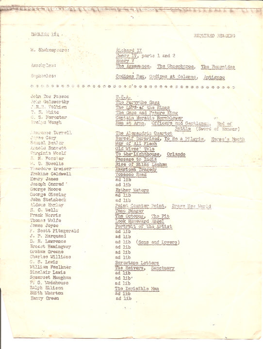 A summer book. A stack of summer books. I recently came across a copy of the syllabus for my honors English class in high school. Forty years ago. The teacher, Chuck Aschmann, was some kind of a genius, and he brought out the genius in his pupils. Just page 1 of the reading list would be enough for more than a single college literature course.