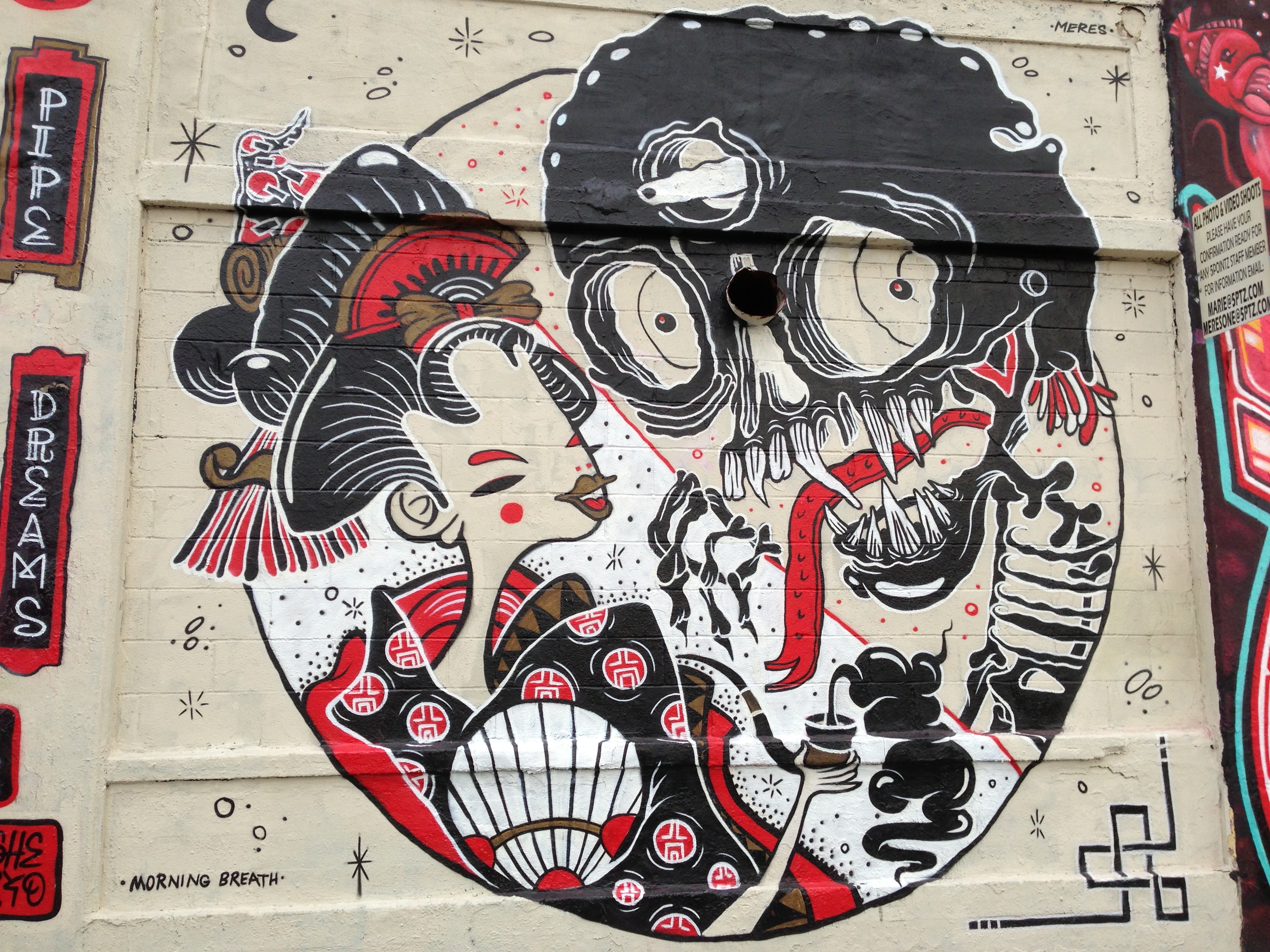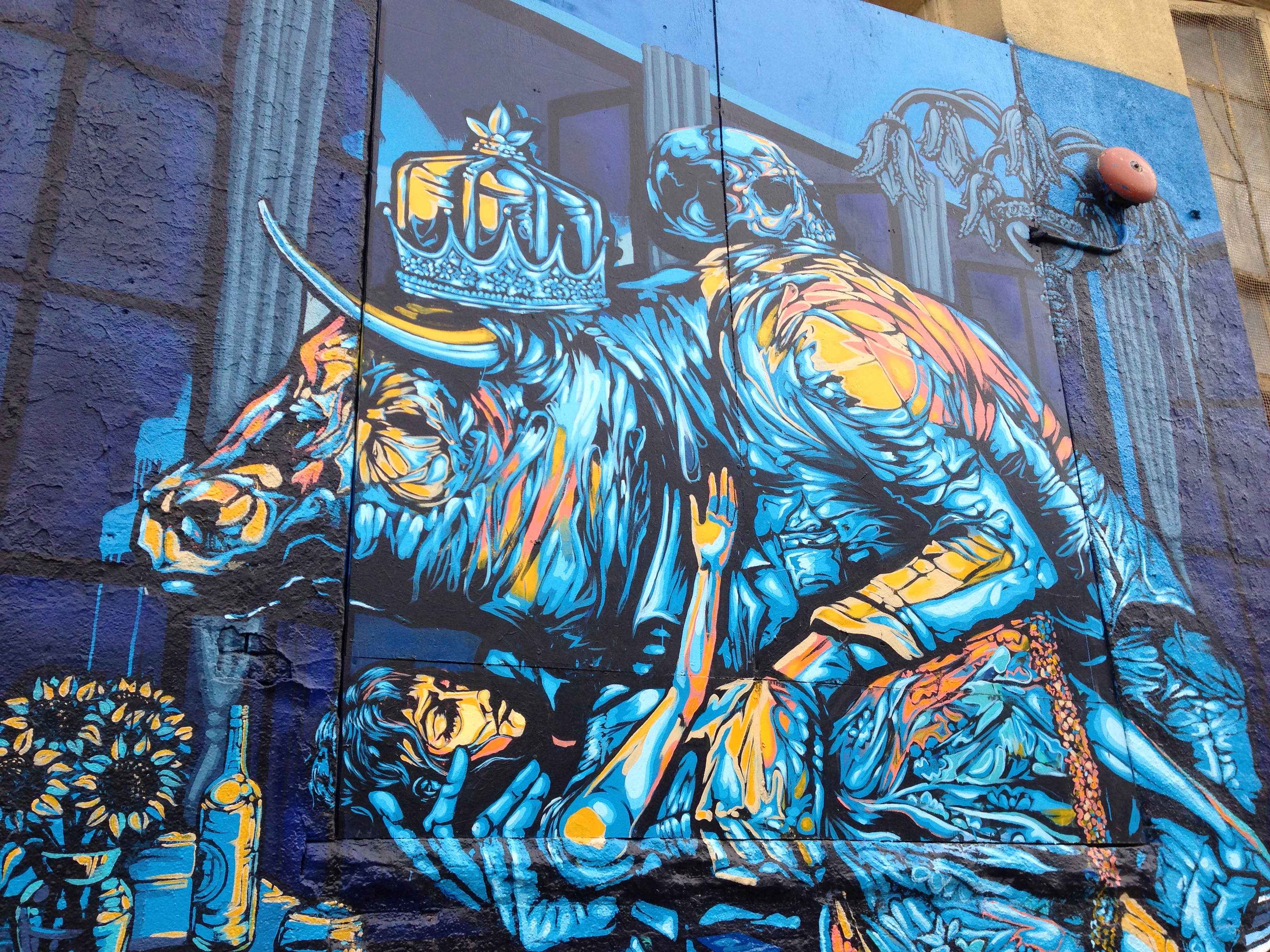 Today we saw a disturbing blue bull by Chicago-born Estebana del Valle, who gave an interview to the 5 Pointz website in which he said that he first tagged a bench at his junior high, moved on to K Mart and bridges and now shows his art in galleries.