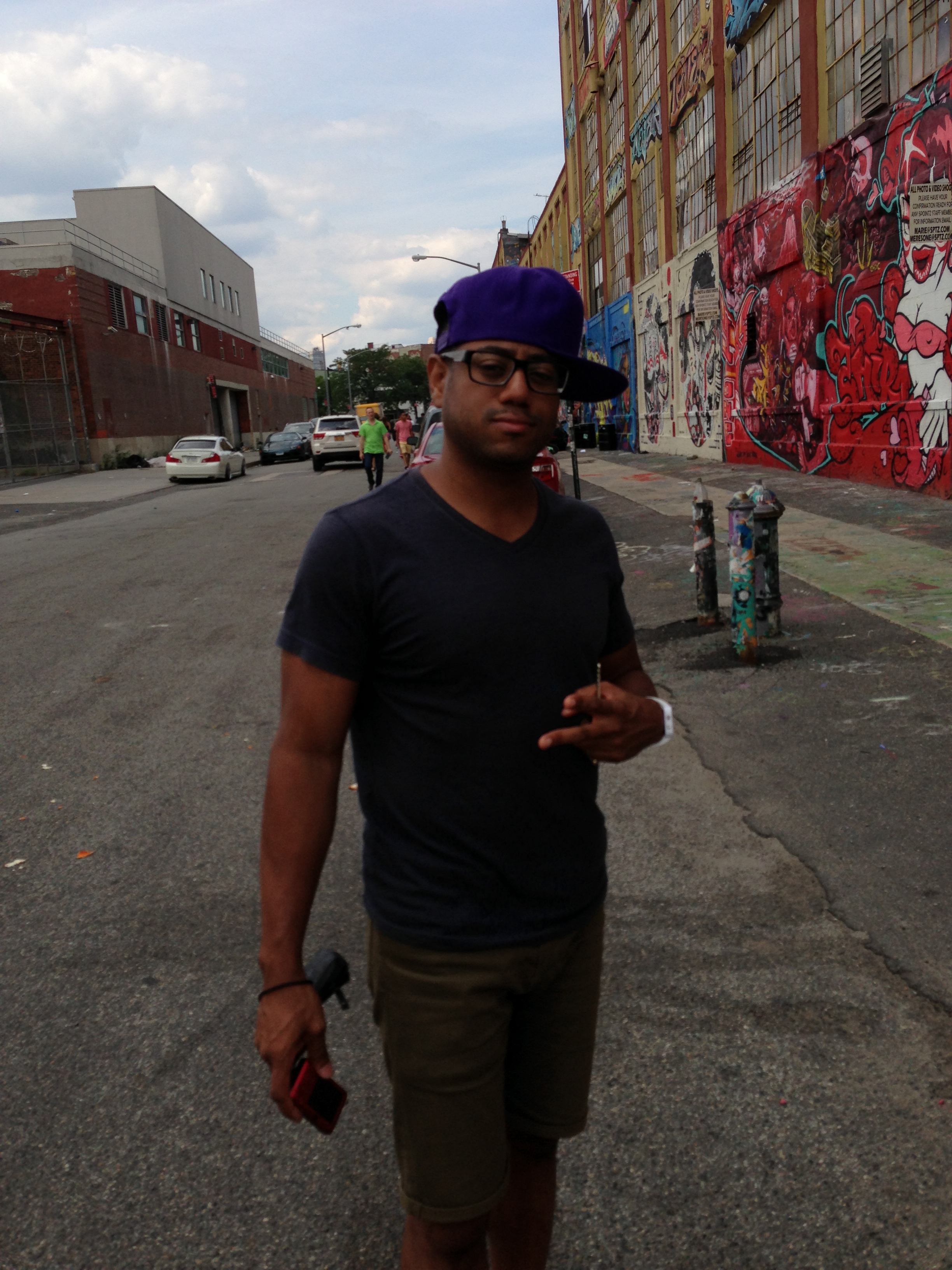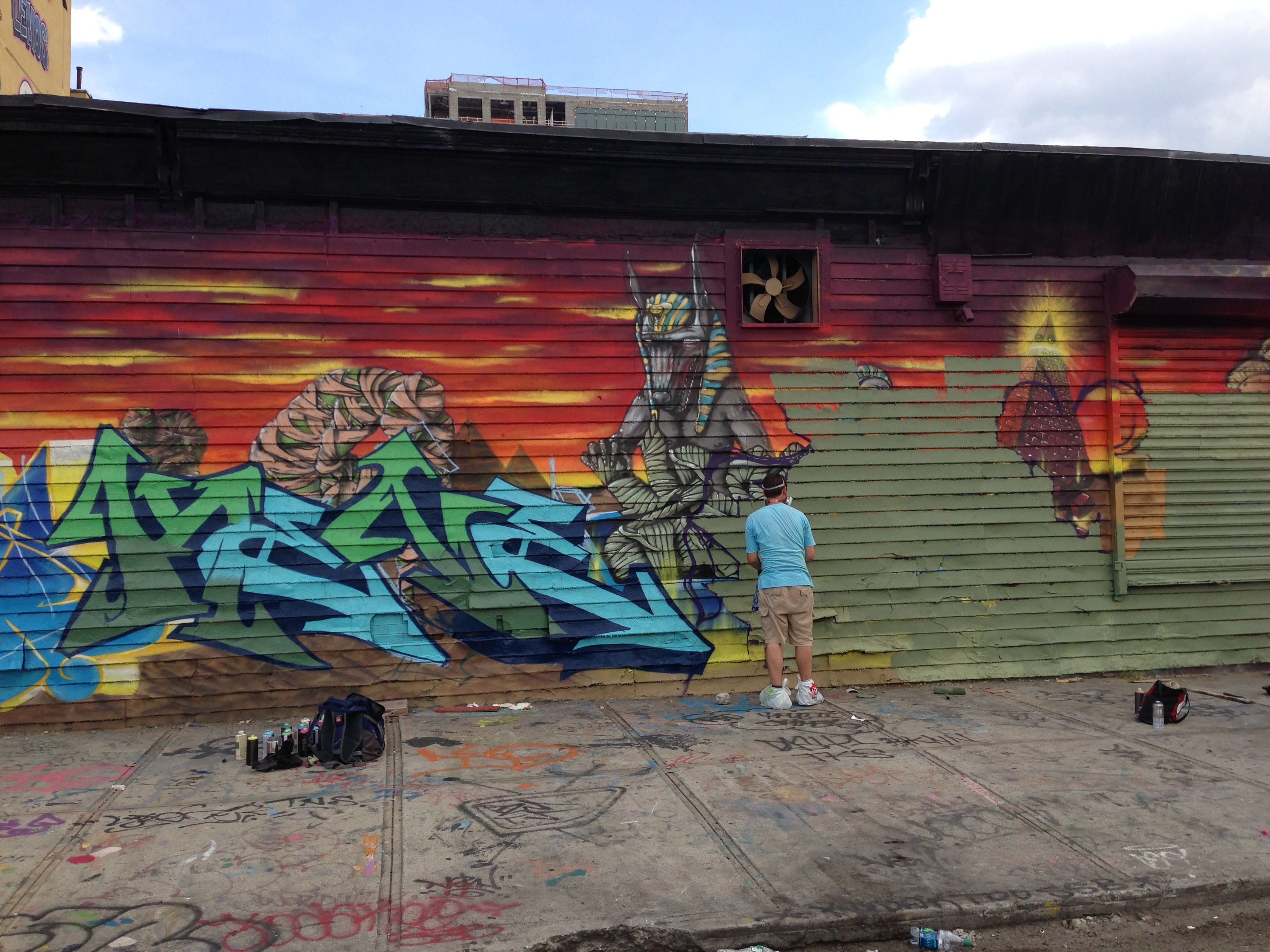 We only managed a small slice of the 5 Pointz scene. As we headed down Crane Street, a crew of two was slapping up some new paint, in the center of which was the outline of a dog to be colored in later – the image, I was told, came from the internet and was some kind of “folk image” of a canine. To me it looked like Oliver had recently posed.