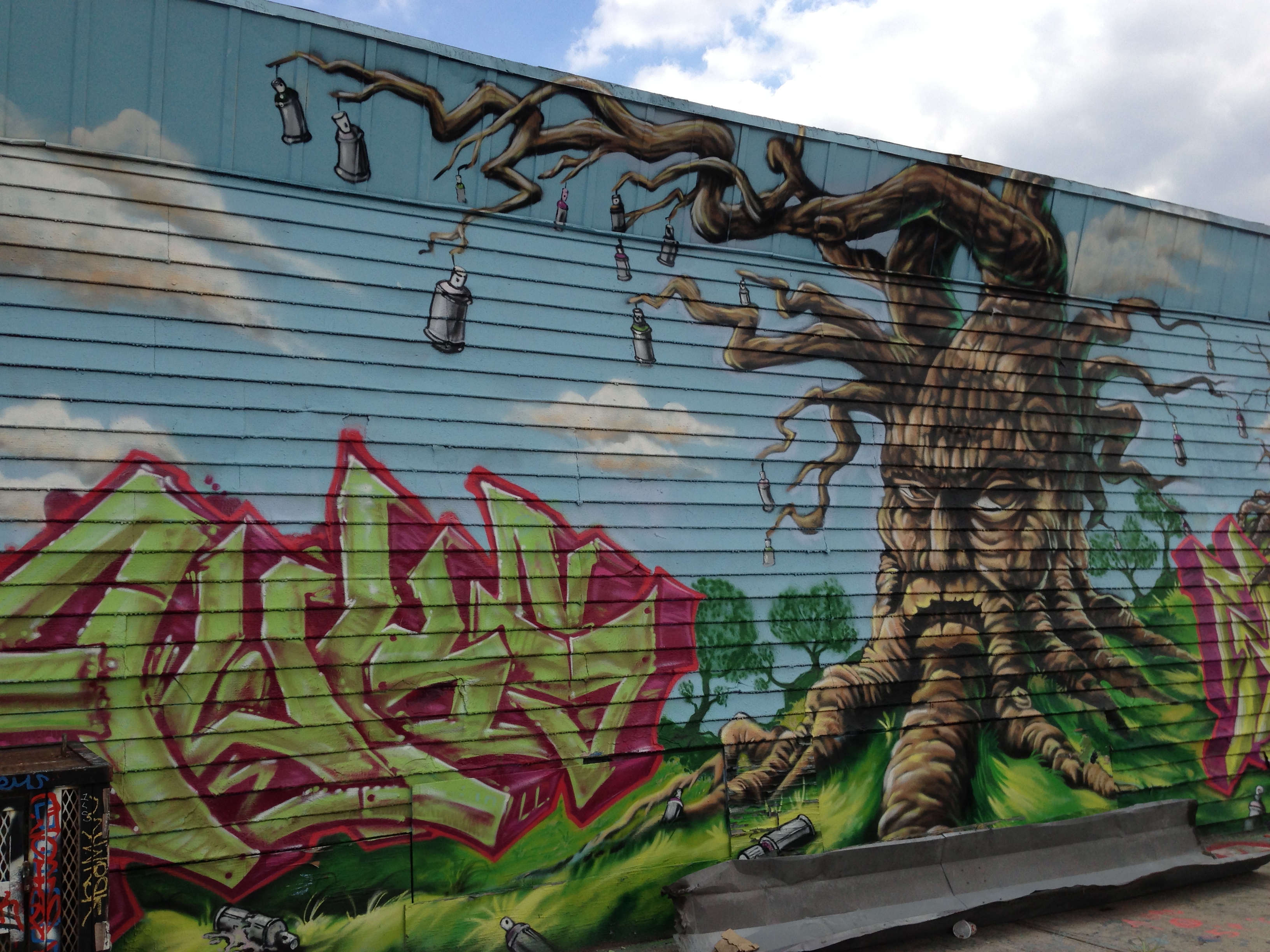 A lot of graffiti is self referential. Note these dangling spray cans.