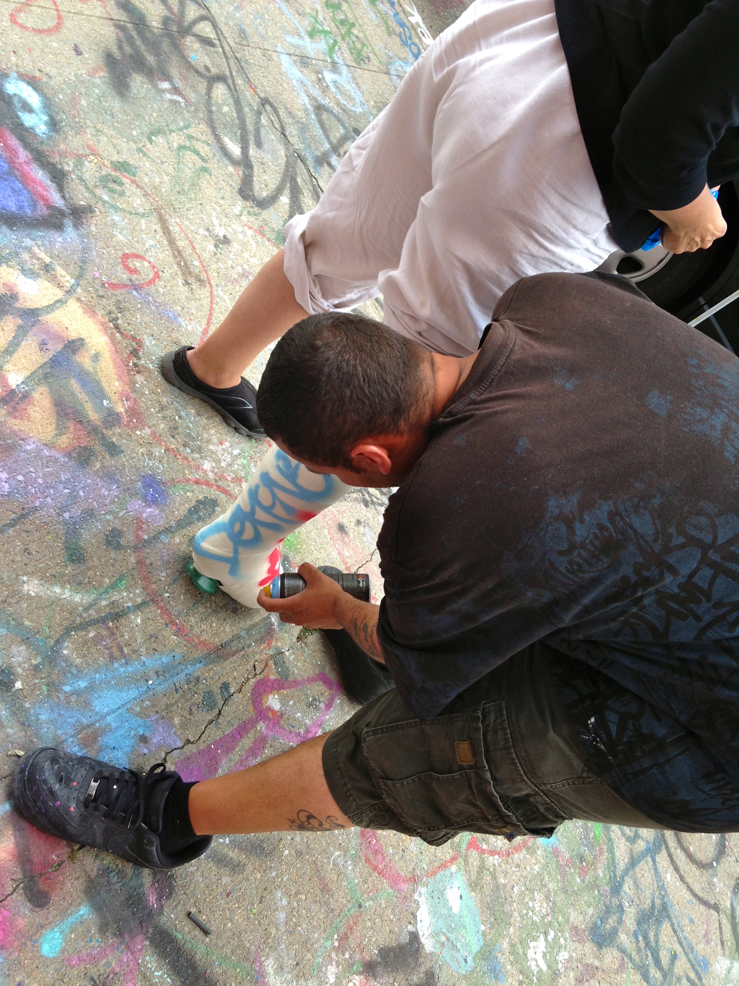 Ream added the final tag to my cast, one he said he’d passed down to his three-year-old son — Demon3. He told me he’d just had double bunion surgery, that they’d cut one bone and shaved another and that he was still in pain every day. And here he was, erecting some kind of kaleidoscopic Kandinsky on a wall in Queens, New York.