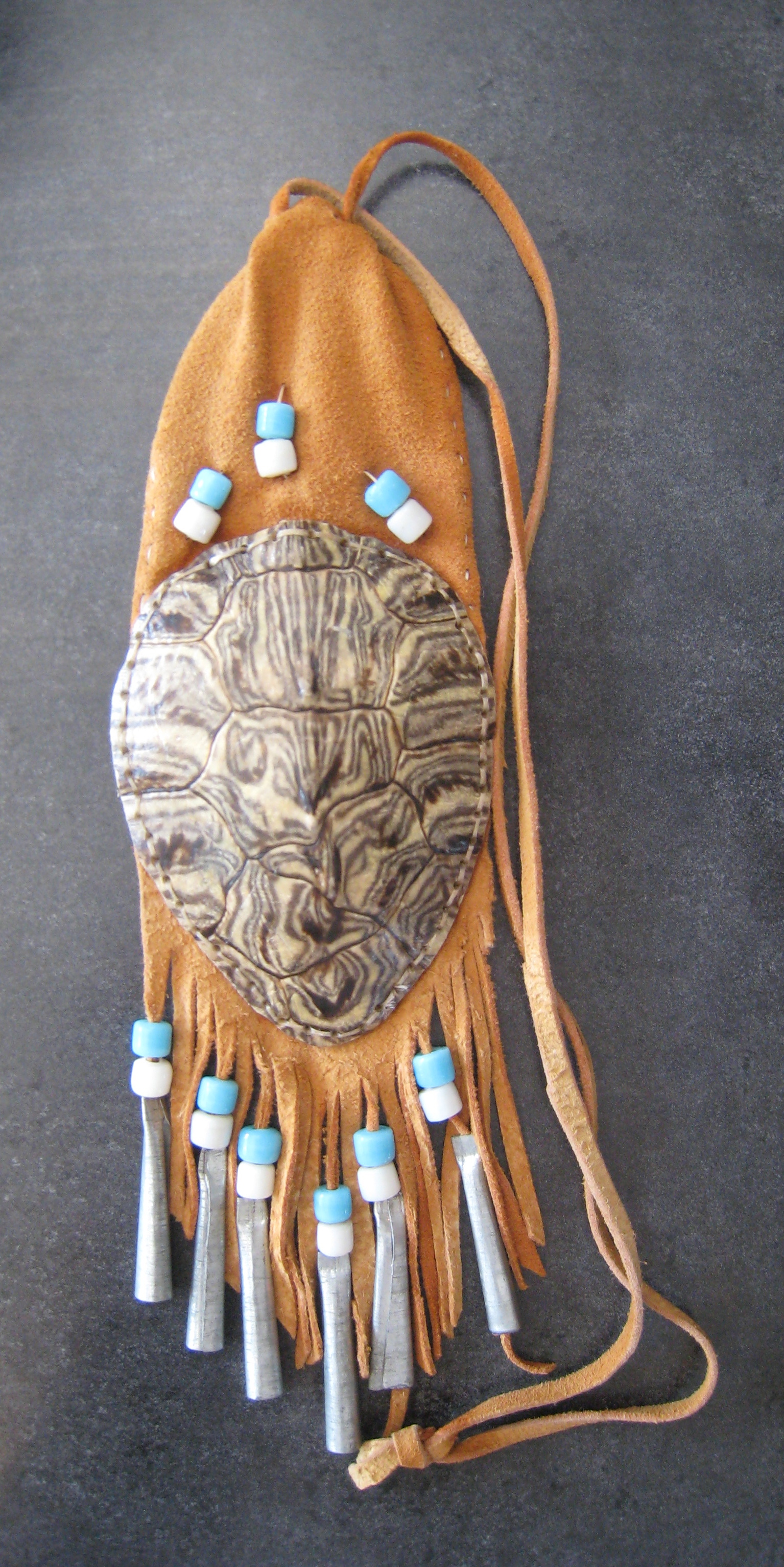 A deerskin pouch adorned with a baby snapping turtle shell that Peter plans to bring with him when he leaves.