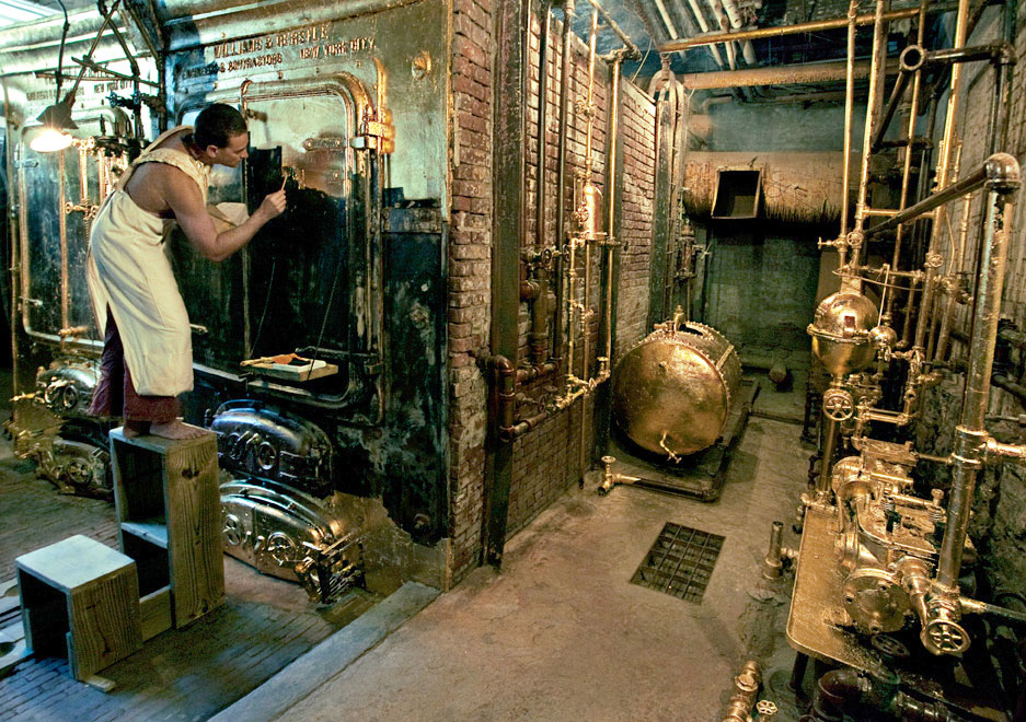 What I liked perhaps the most was a permanent piece, the gold-leaf covered boiler system in the basement, the work of Saul Melman in 2010. This is a vintage coal boiler out of Freddy Kruger, in a dank stone and brick cellar that reminded me of the basement I grew up with, penetrated by boulders. I could only see gold-gleaming bowels from the upper doorway as I could not descend the stairs, and I wish I saw the artist in action.