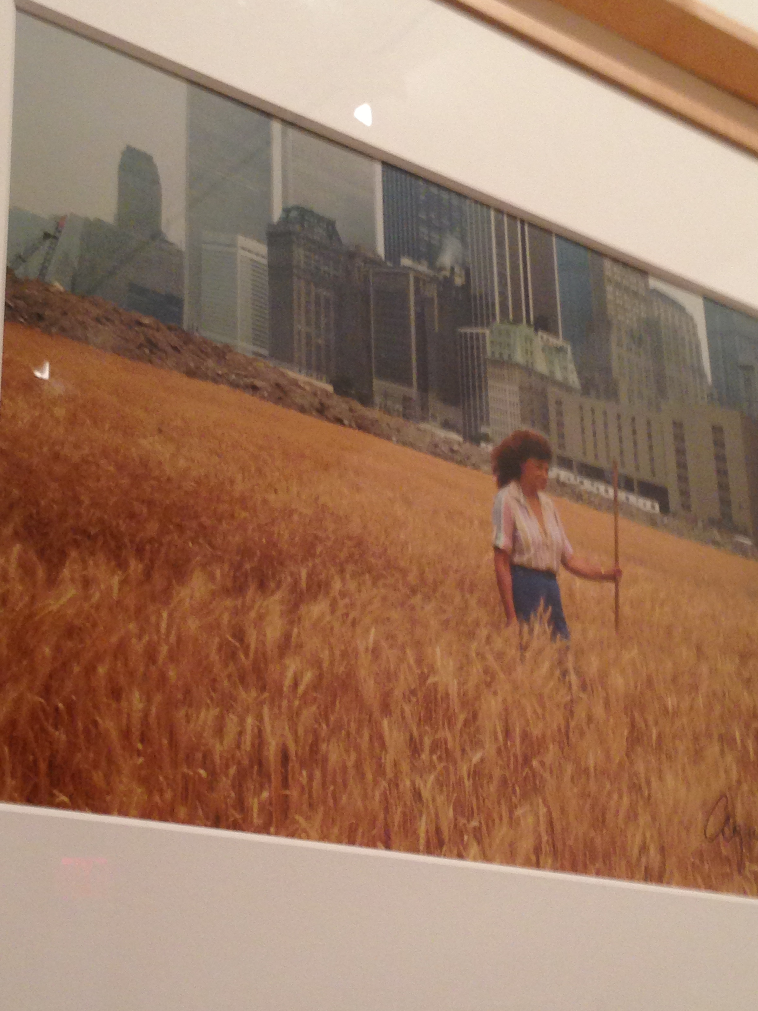 That’s from a series by Agnes Denes, completed in 1982, for which she planted a field of grain in what was then undeveloped landfill and is now hugely built out Battery Park City. Her photographs show unsettling views of the World Trade Towers half hidden by amber waves in the foreground.