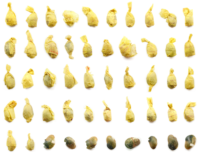 Her own photos tend to the more delicate. This image she calls “Bundles,” comprised of seashells from a museum collection, wrapped up like bon bons.