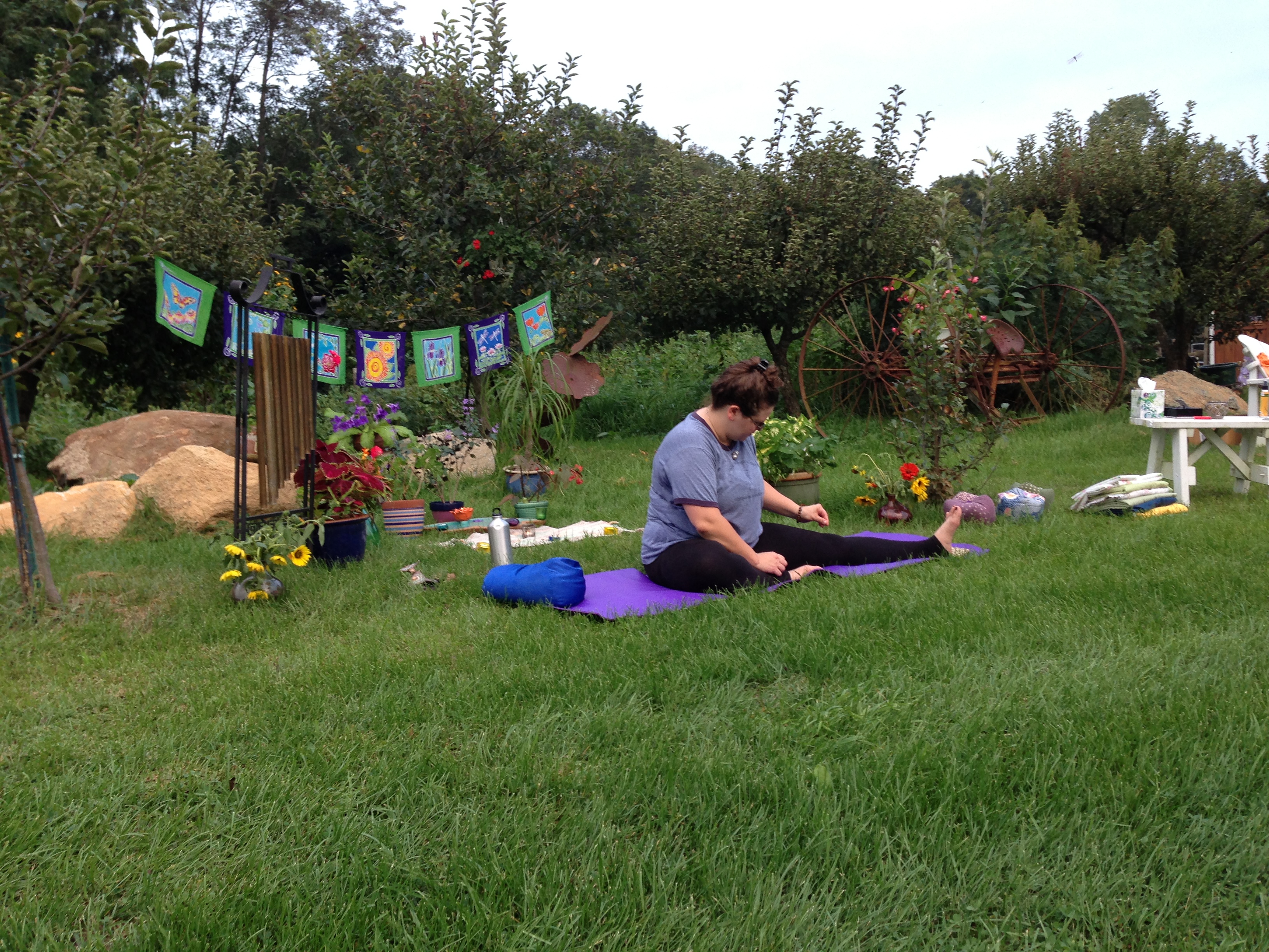 I didn’t know if the people there would be nice about my infirmity. Maybe they’d be yoga-fascists, insisting on fast, sweaty gyrations, on keeping up a certain pace. But as soon as we set up, a woman hurried over to offer me a plastic chair in case I needed it. It turned out to be Linsay Cochran, who manages this century-old family farm. So gracious, and so welcoming.