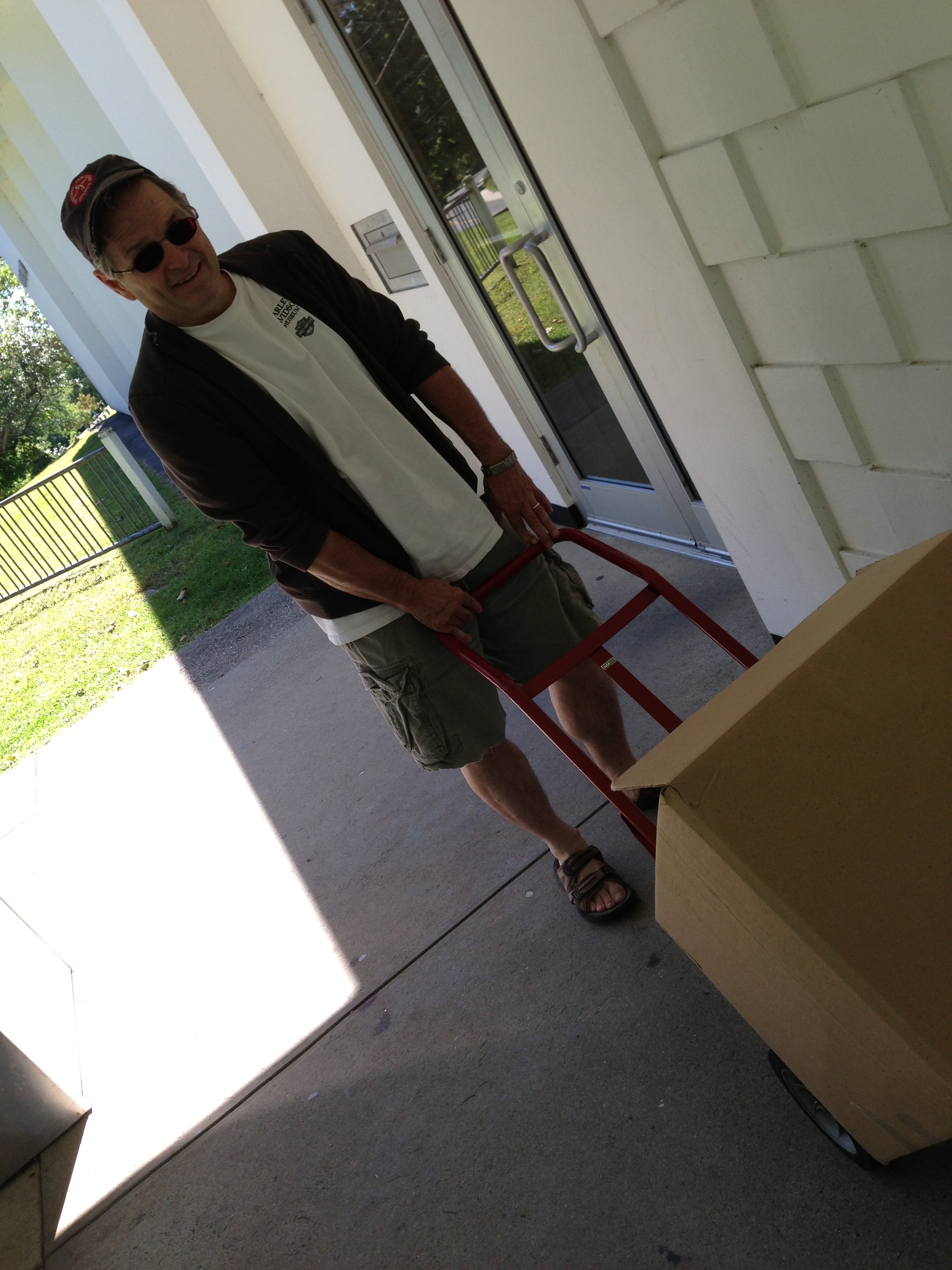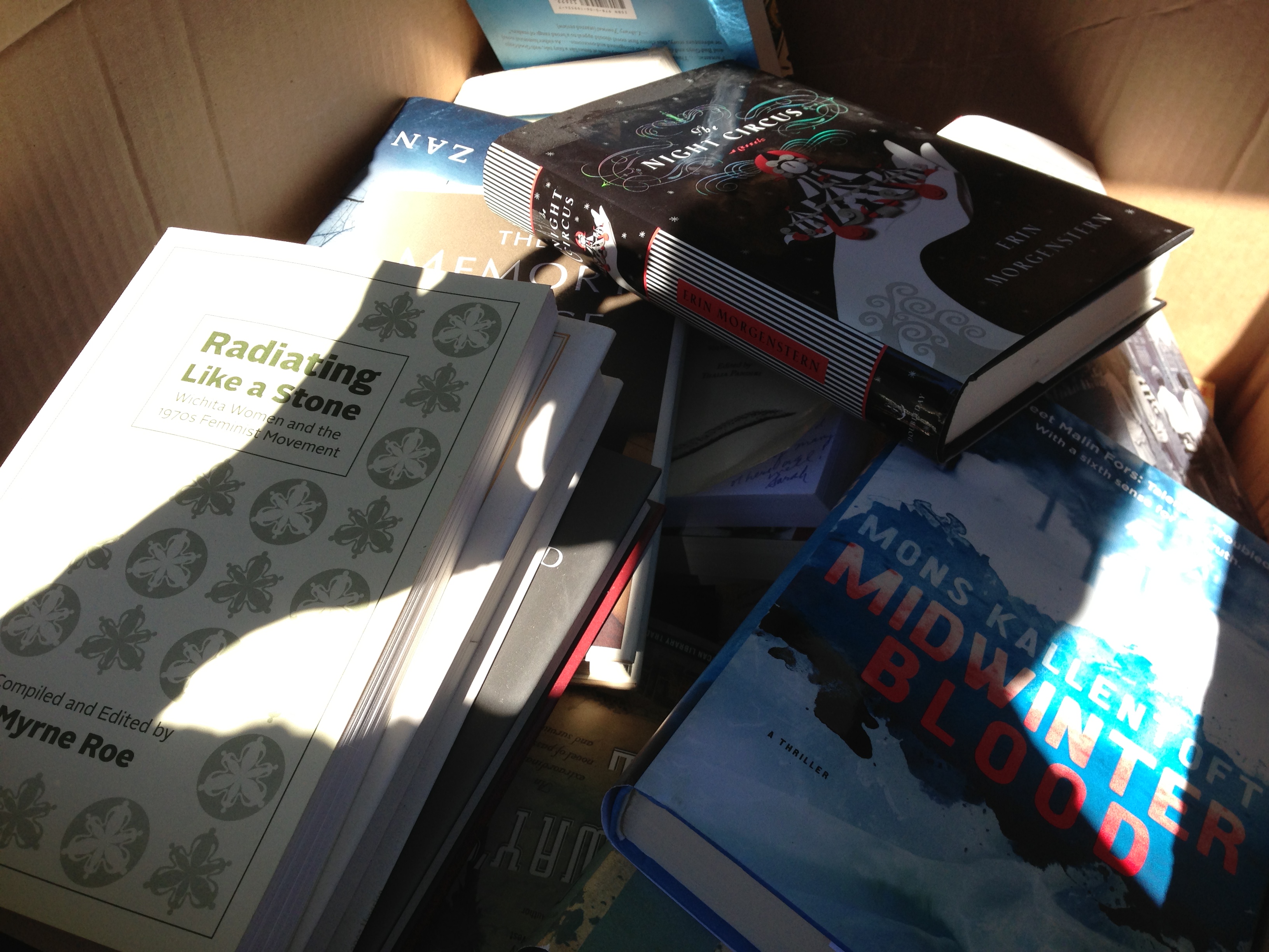 I am in the grips of a book-shedding catharsis. I realized today – and this is the way it often happens for me – that I couldn’t let another hour go by without winnowing out my book shelves. I insisted that Gil sort his office, too. (He couldn’t find any to give up, but he tried.) The resulting 100 or so cast-off titles went into an extra-large packing box.