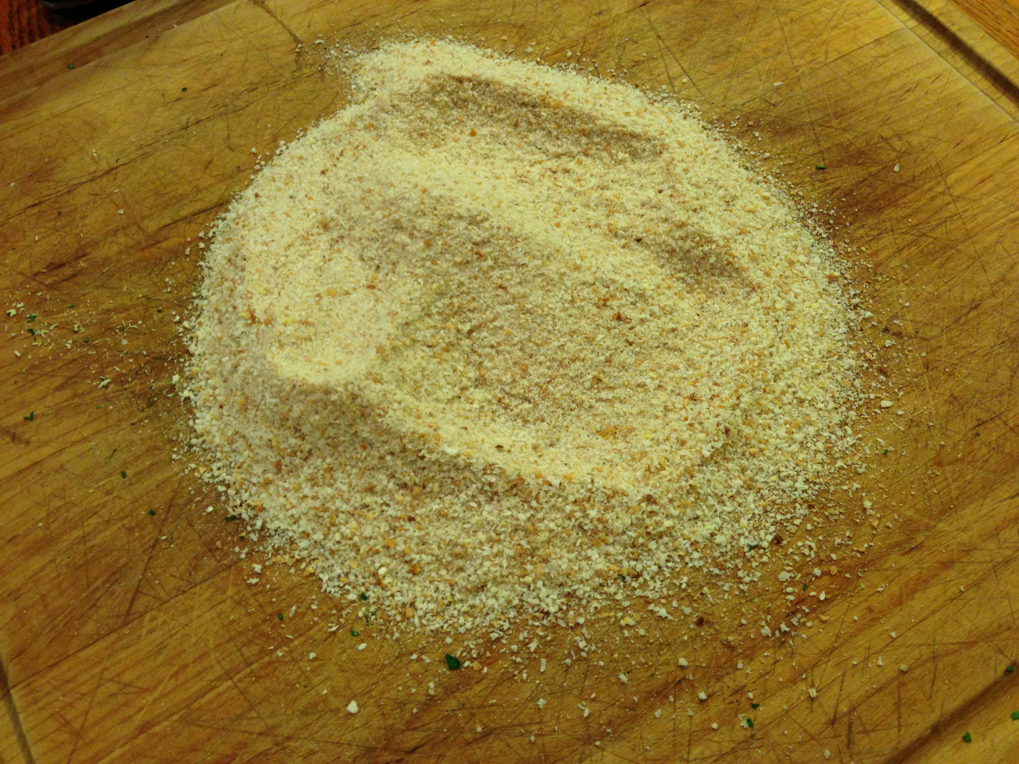So does Gil. He said he’d take part in the meatballs’ production, though he had other things he could have been doing this afternoon. I showed him how you roll the meat in a pile of breadcrumbs. Good breadcrumbs. The better the quality, the better anything you make with them.
