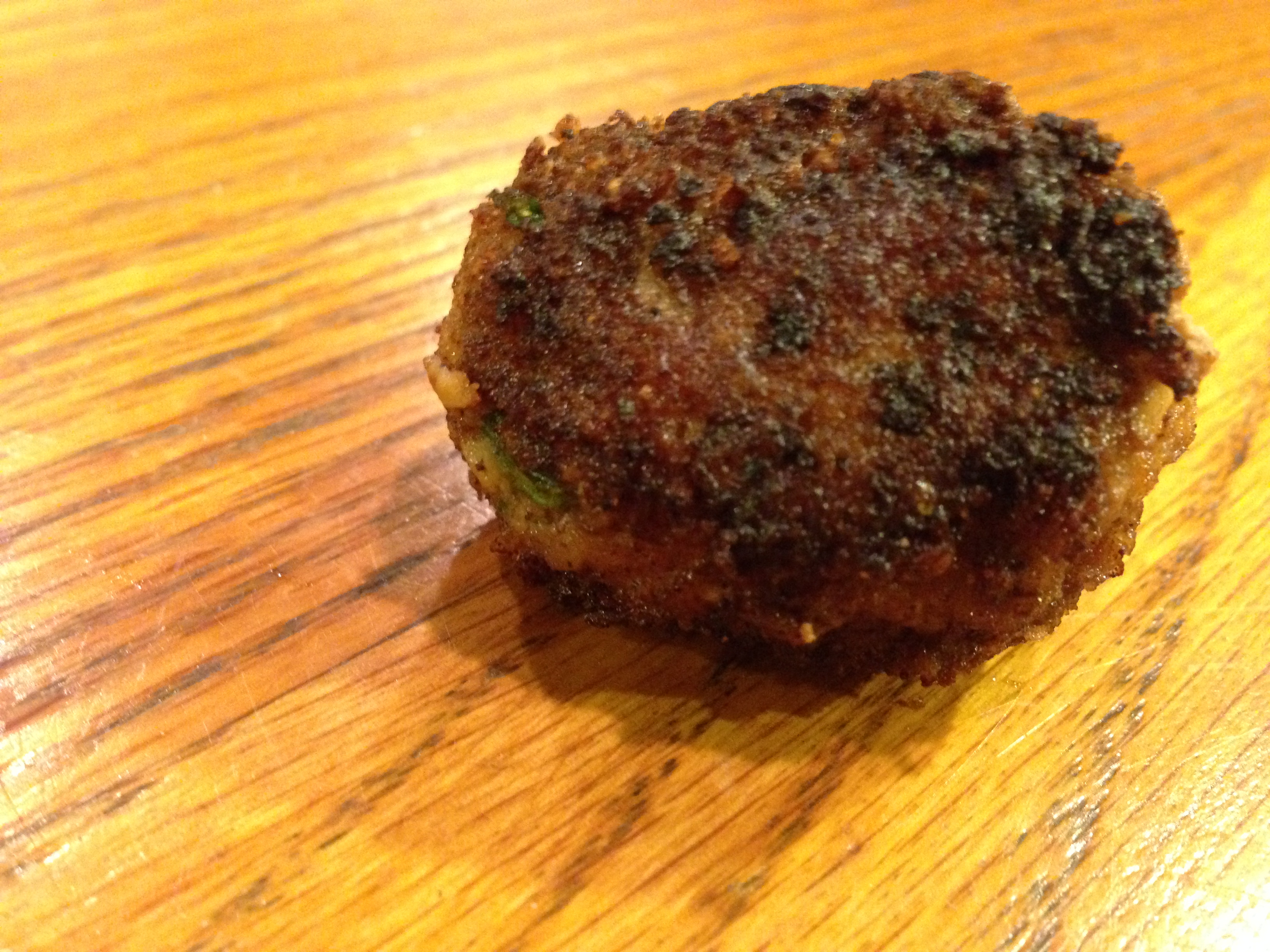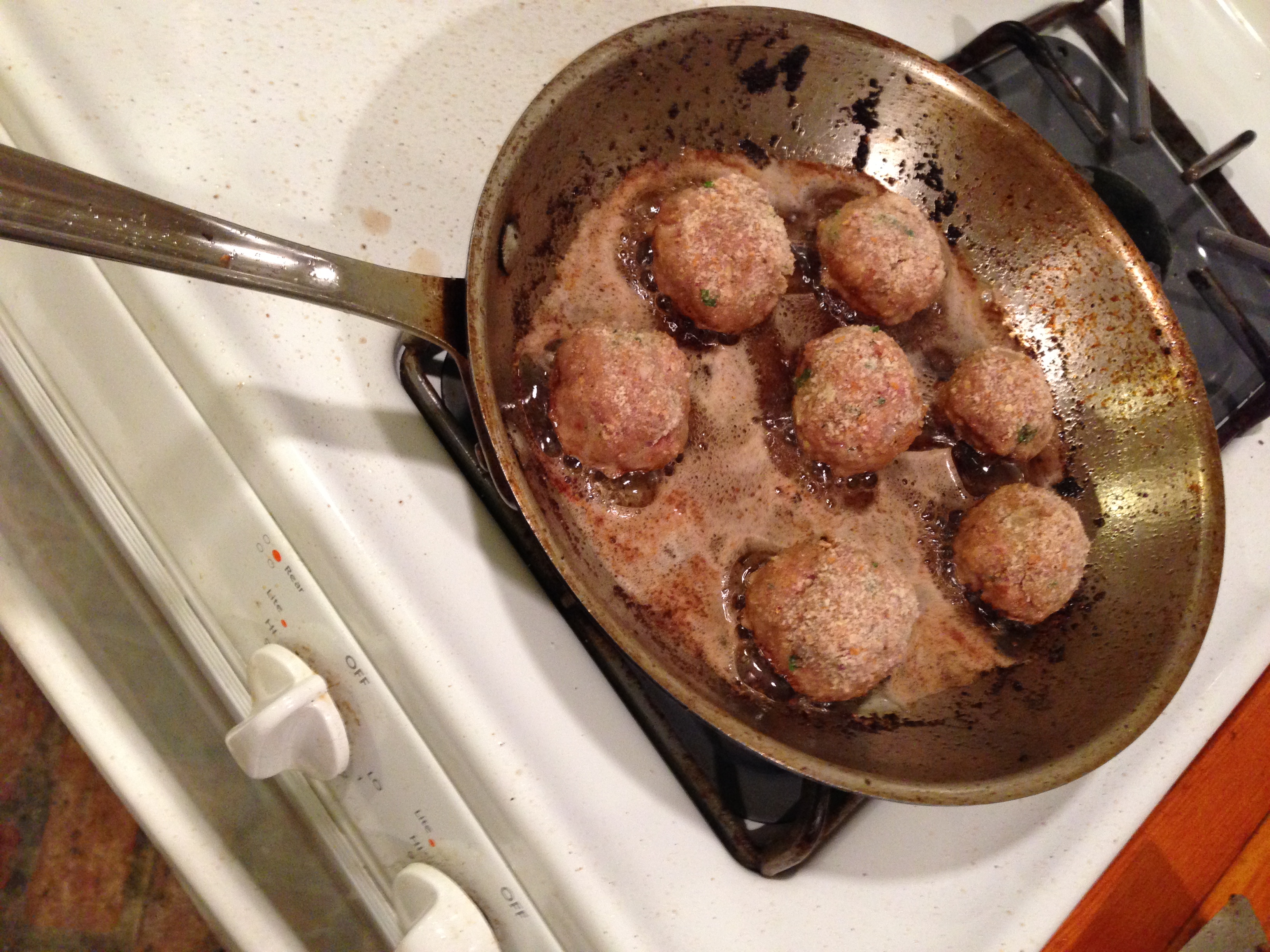 The meatballs sizzled in hot oil. We split a few open and almost burnt our mouths stealing a savory bite.