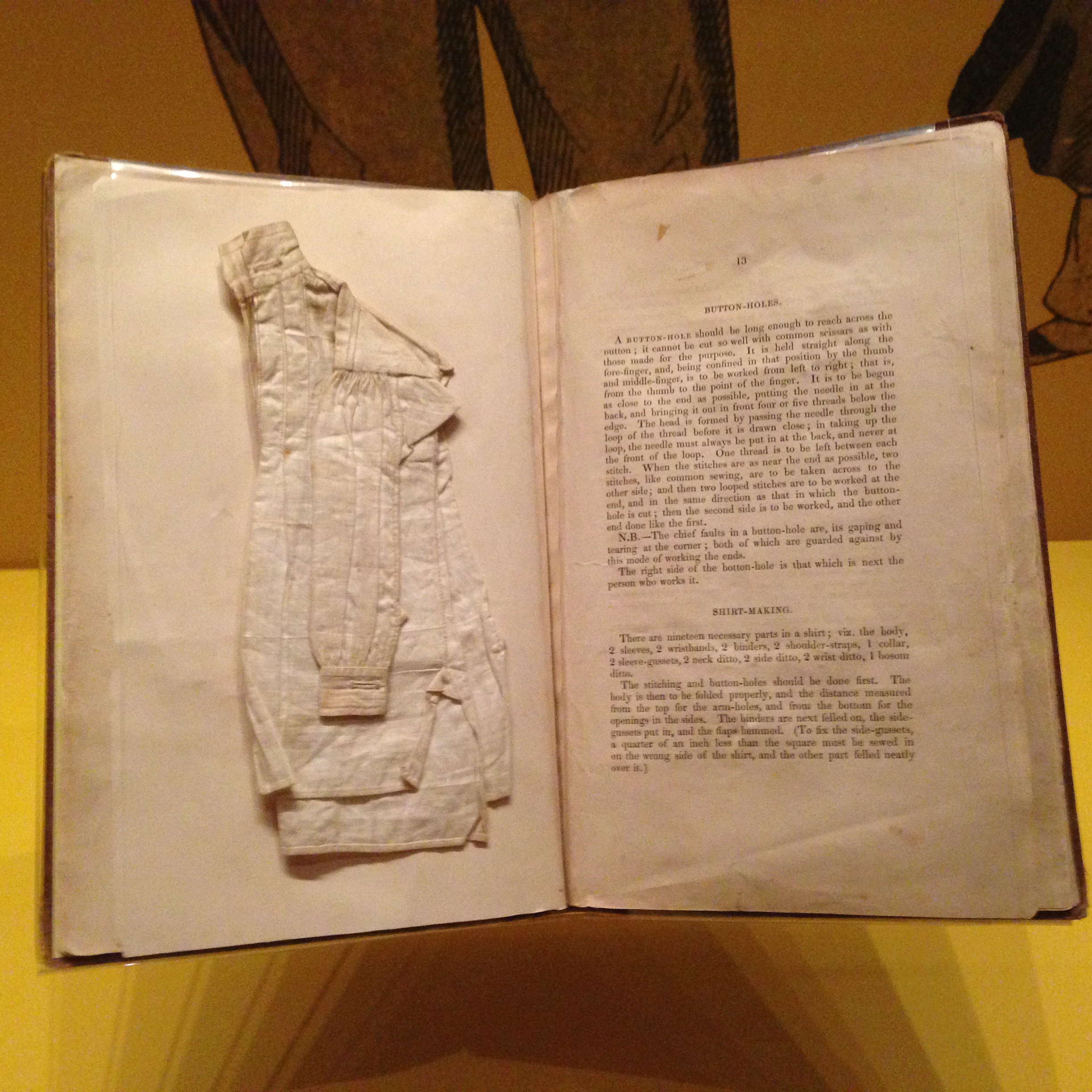 I was interested in Instructions on Needlework and Knitting, from 1847, published in London, whose valuable pages had an actual doll’s dress sewn into the book.