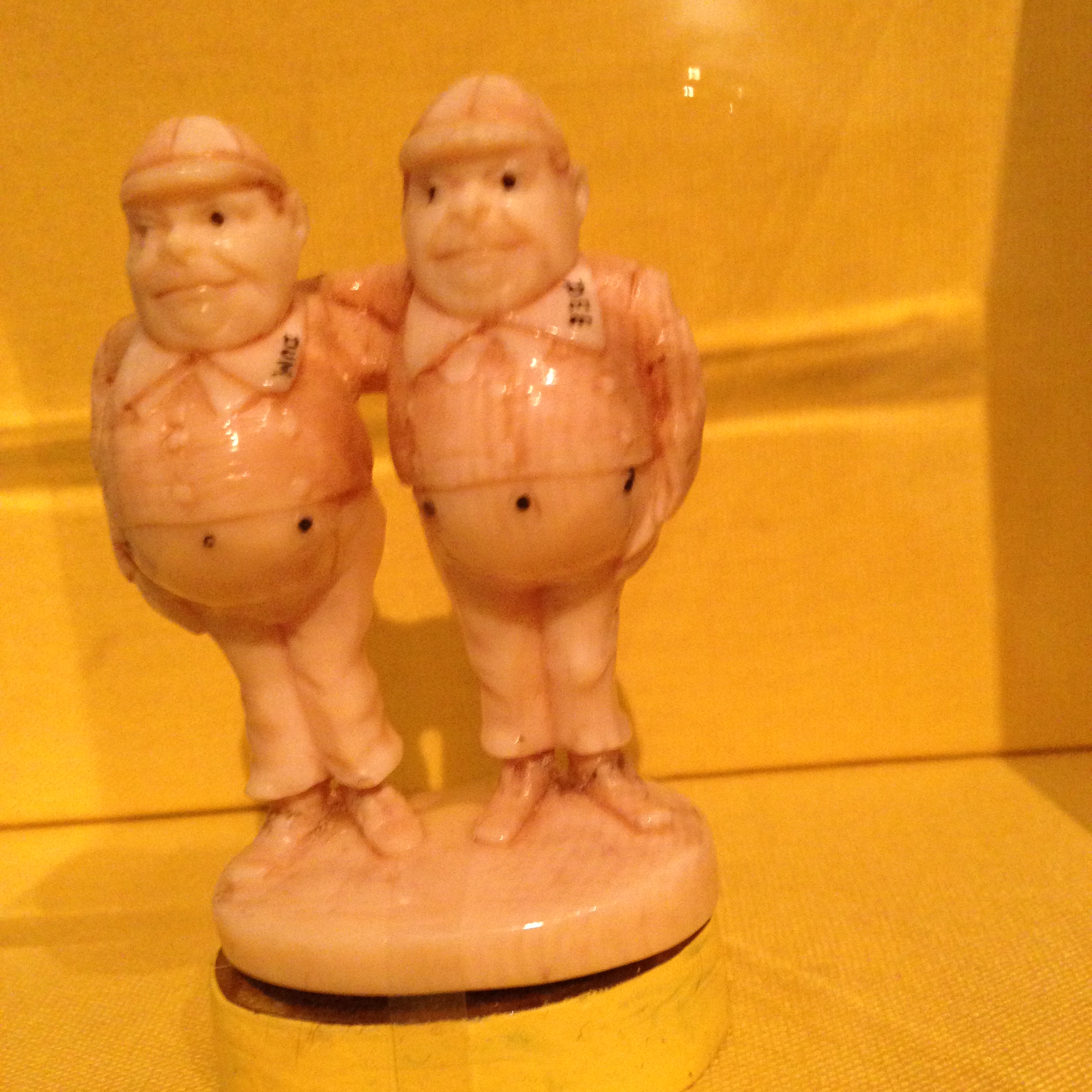 I turned the corner and bumped into another historical nugget, the Tweedledum and Tweedledee parasol handle that Lewis Carroll bequeathed upon the former Alice Liddell, now “Mrs. Hargreaves,” in 1891. The original Alice. She held that ivory in her hand.