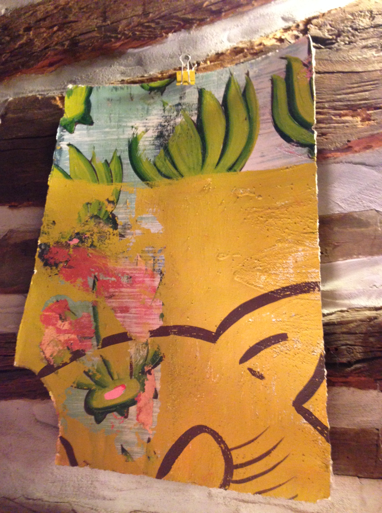The Cabin makes a perfect backdrop for a painted work like the one my artist friend Sandra bequeathed, titled “Cairo in the Garden,” named for a beloved tabby we owned with seven toes on each paw.
