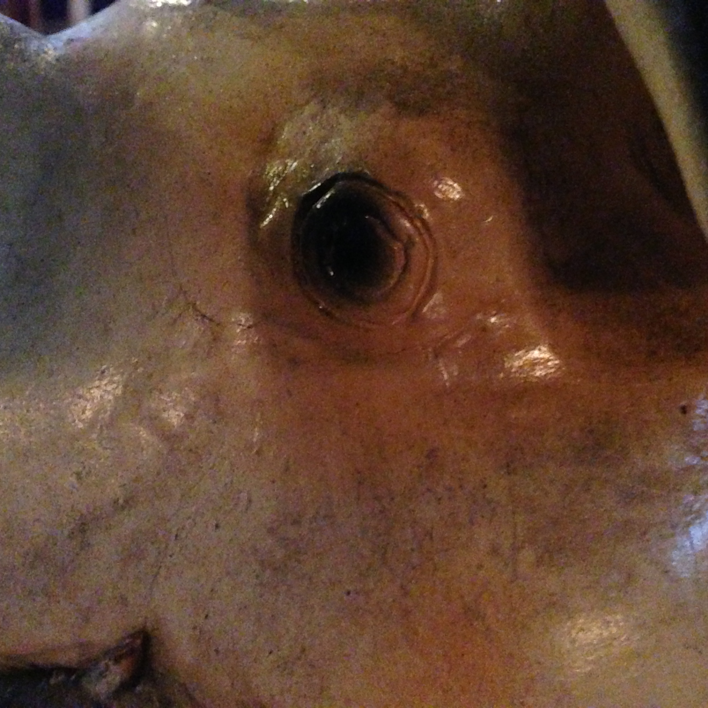 Back to the pig without a wig. Where to exhibit his bulbous corpus? I think he needs to stand by the door, sticking out his tongue in welcoming us. Or by the hearth, though I wouldn’t want his fat to singe. Perhaps the kitchen would be the most logical, given the amount of bacon this household consumes. In a corner, where we can observe him observing us.