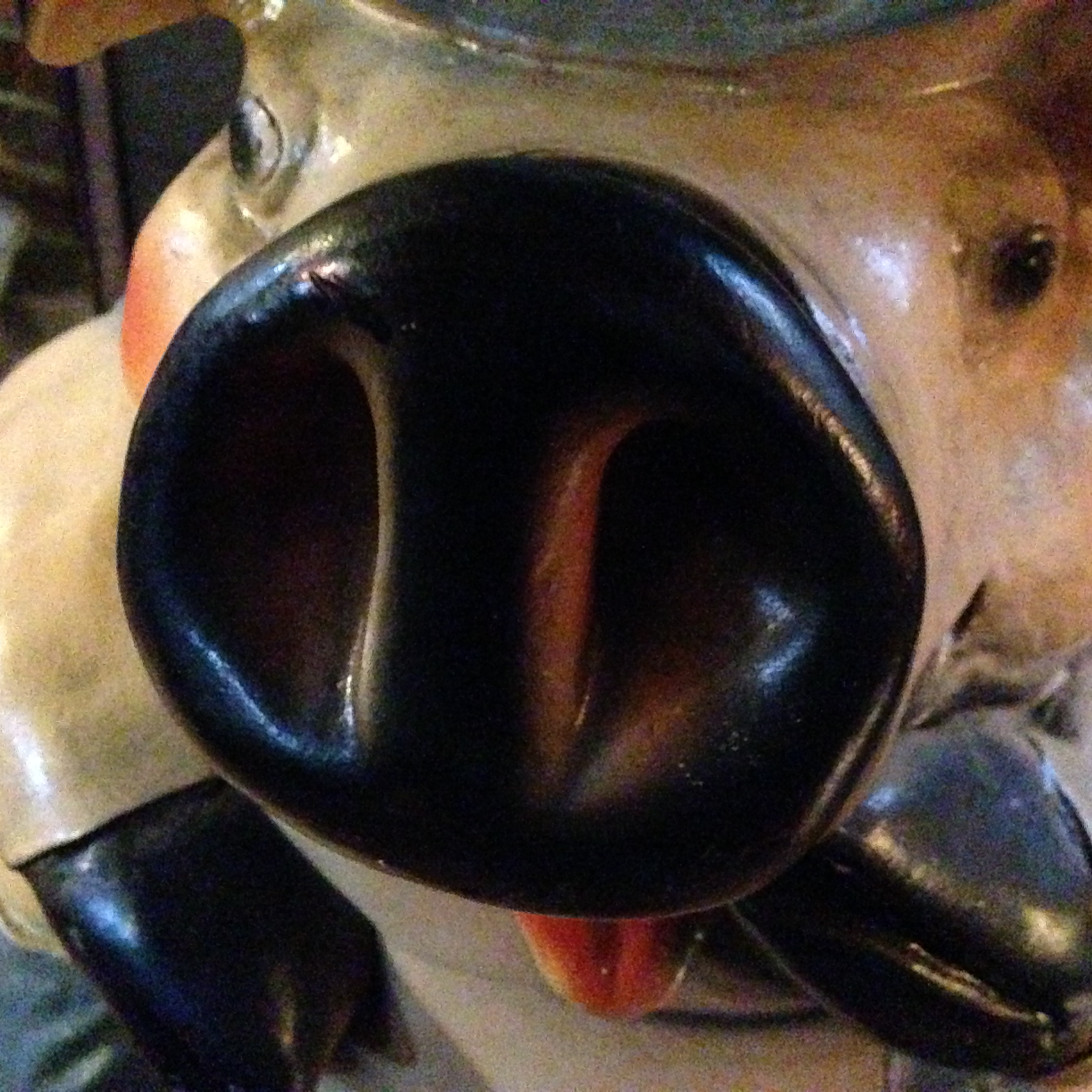 We decided the painted plaster pig with the voluptuous nose must have at one time enticed customers in a store or eatery. The woman in the antiques shop felt sure he had a former life as a piggy bank, but no piggy bank is thigh high. I snapped him up quickly, before anyone else could. If anyone else would.