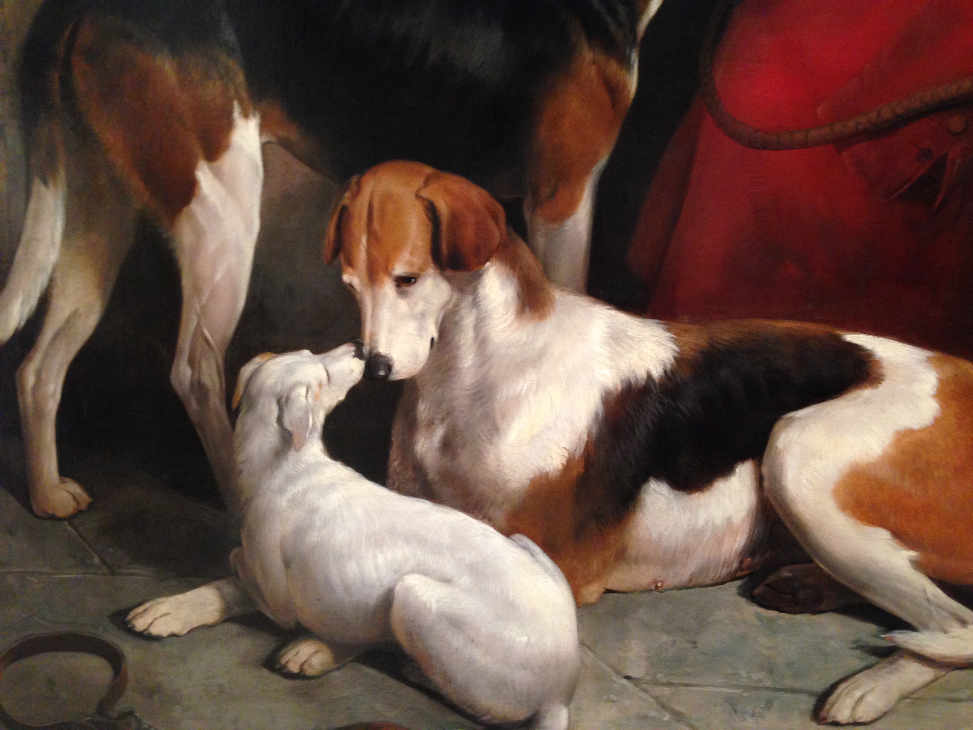 The painting chosen for the display that I found most affecting was William Barraud’s A Couple of Foxhounds with a Terrier, the Property of Lord Henry Bentinck. Hicks has said she recognizes Baraud’s profound understanding of how the “social structure” unites the animals depicted. It’s about the independent dogness of dogs, despite the humans that may believe they own them lock stock and kibble.