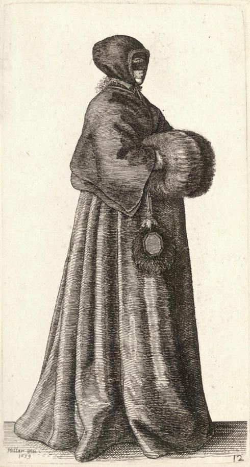 The extremely fashionable London lady in Hollar’s “Winter” Dress from 1643-44, in the collection of the British Museum, sports a voluptuous muff and is draped in furs besides, but perhaps the most curious thing about her is her facial accoutrement. Beneath the image runs the legend:
