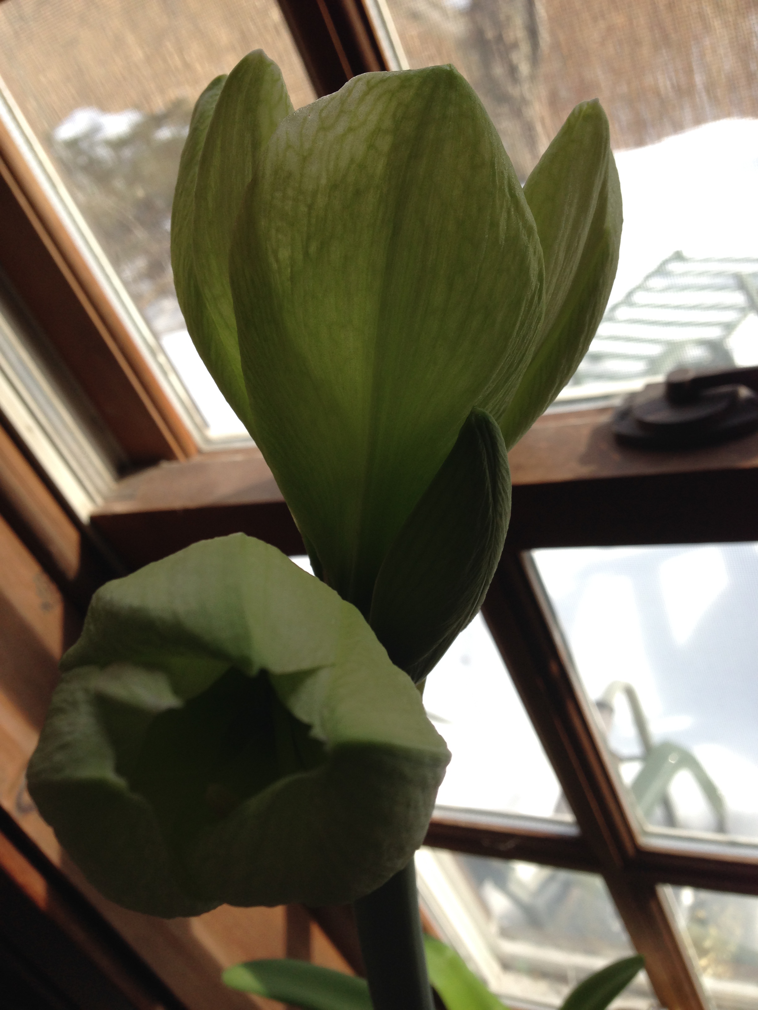 My new novel is blooming. Much like the amaryllis opening up beside my desk, at the window overlooking the marsh. This plant with its glowing greenish-white flowers doesn’t care about the snow and cold, it’s gonna display it’s stop-motion beauty on its own time, as it pleases. I’m just there to write it along.