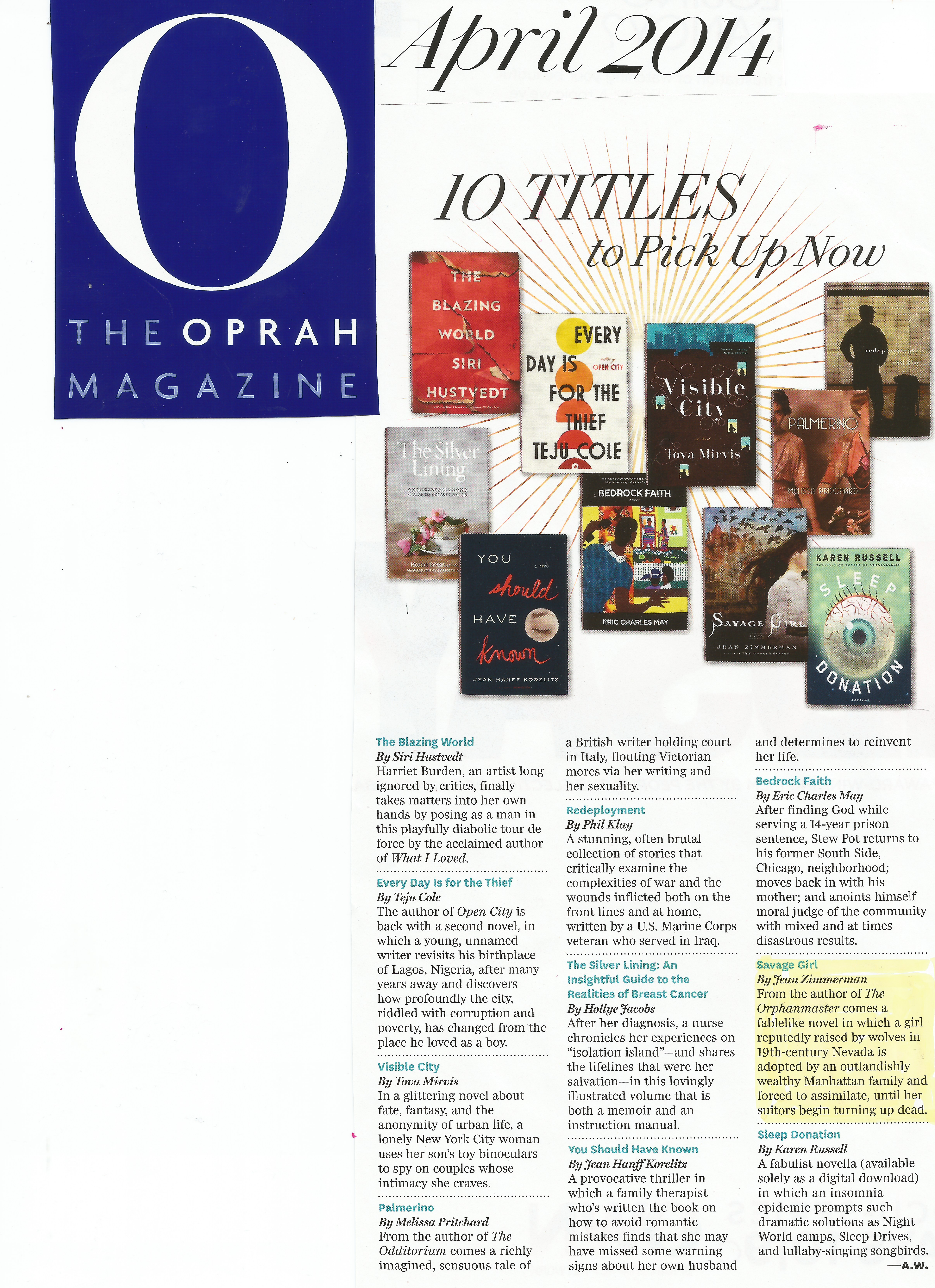 A friend of mine mentioned that she read the glossy’s April 2014 issue and saw Savage Girl highlighted there as one of “Ten Titles to Pick Up Now.” She probably noticed this while sitting in the pedicure chair of her local nail salon. Anyway, that is where I usually thumb through O.