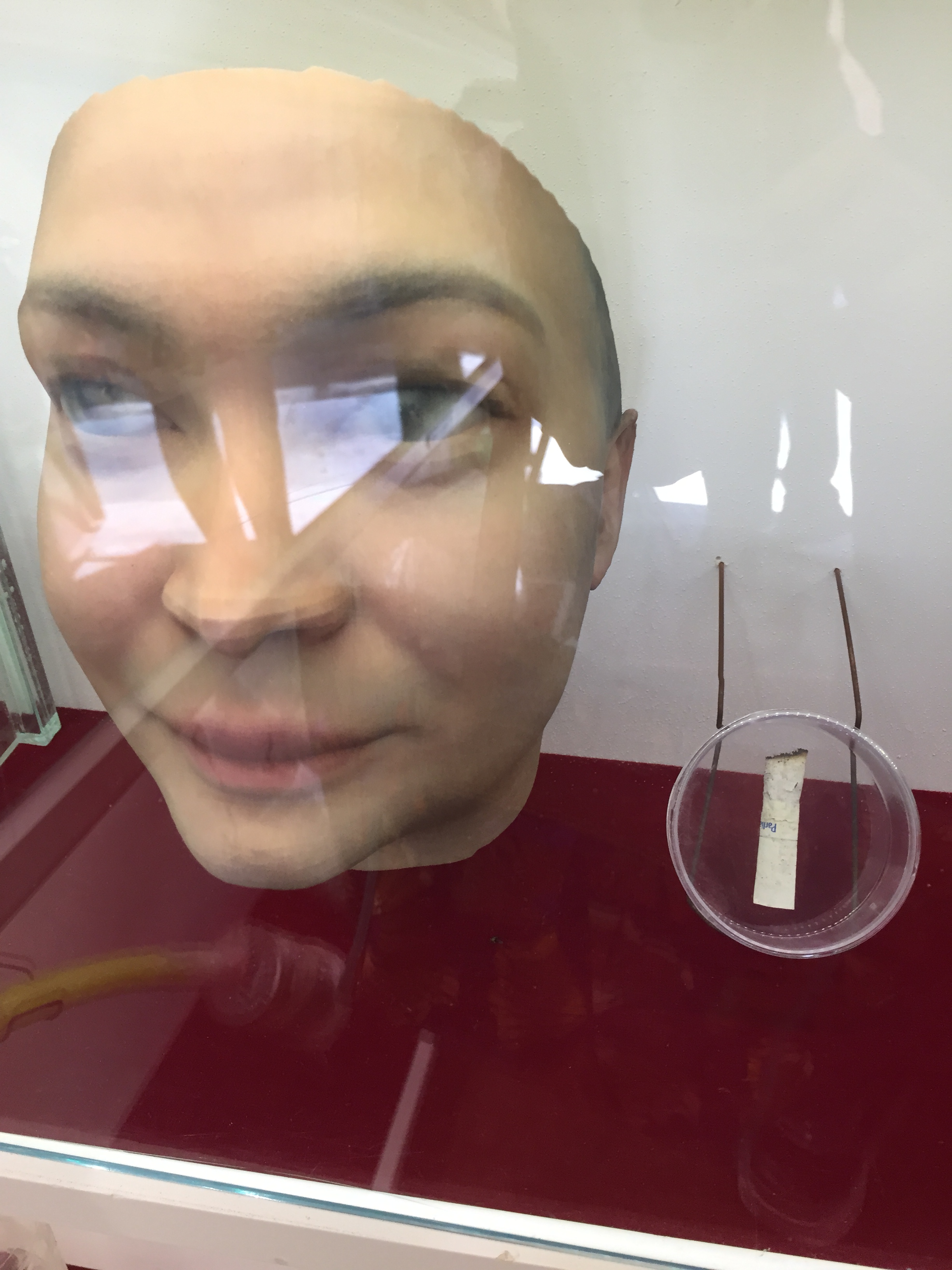 Curious as to whether this diminutive place was a giant hoax or a cracked art installation or the real thing, whatever that might be – in other words, whether someone was laughing at me as I perused the rubber chicken wing and the real fake pork sandwich on the wall, I checked out a few facts on the web. It turned out that the thing that amazed me most, a collection of heads called Stranger Visions and credited to Heather Dewey-Hagborg, was the real thing.
