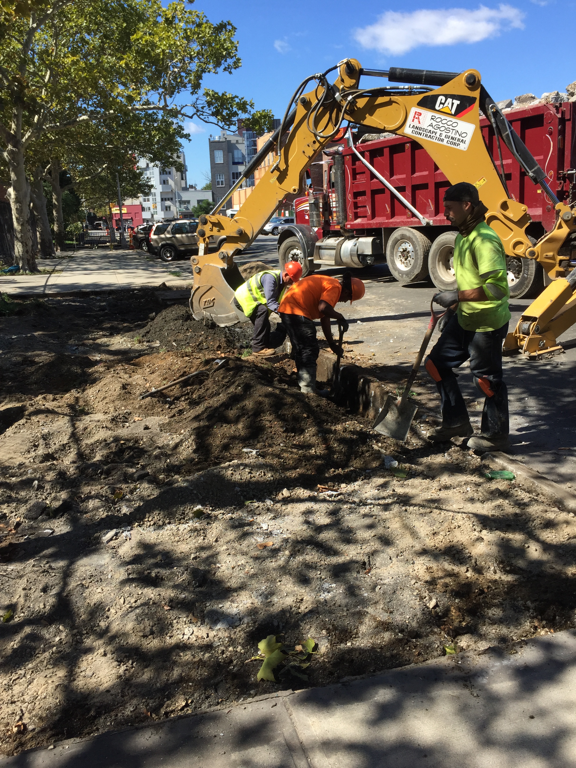 My job today was seeing after the health and happiness of two trees in new pits, #39 and #40 on the site survey, which were having their environs disturbed by the installation of a brand new sidewalk. It’s a discrete job. Somebody has to tell the foreman the dimensions of the new pits (82″ across, back to the playground seam). Someone, in this case, who isn’t a man. One of the things I do as the men around me install curbs, pour sidewalks, do all the lifting, the hauling, the digging: I give life to the new pits.